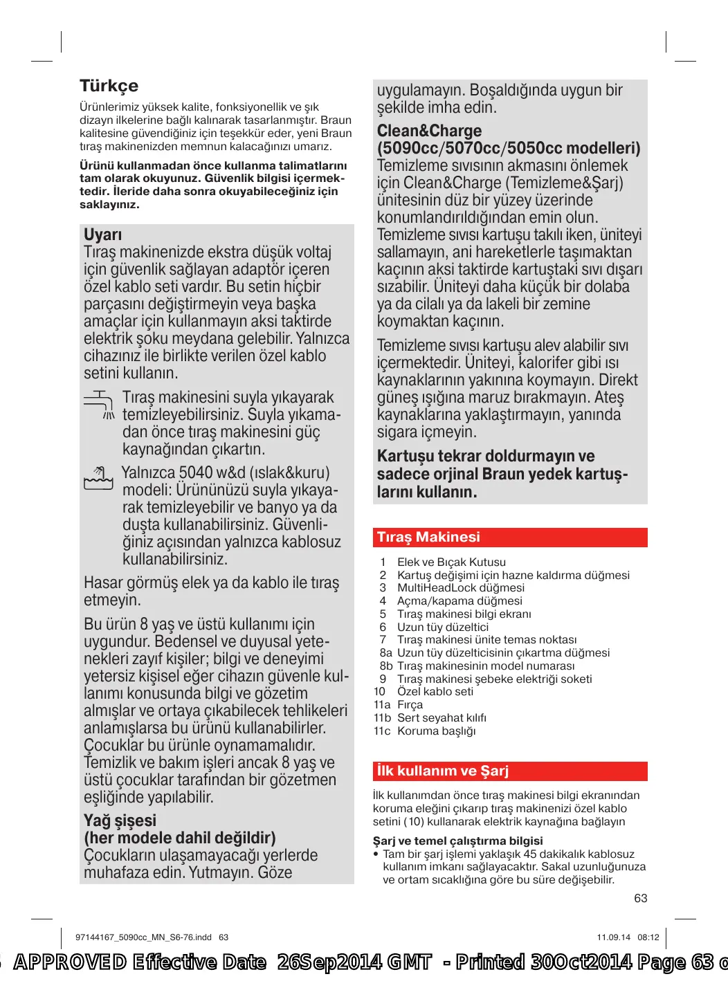 uygulamayın. Boşaldığında uygun bir şekilde imha edin. Clean&Charge (5090cc/5070cc/5050cc modelleri) Temizleme sıvısının akmasını önlemek için Clean&Charge (Temizleme&Şarj) ünitesinin düz bir yüzey üzerinde konumlandırıldığından emin olun. Temizleme sıvısı kartuşu takılı iken, üniteyi sallamayın, ani hareketlerle taşımaktan kaçının aksi taktirde kartuştaki sıvı dışarı sızabilir. Üniteyi daha küçük bir dolaba ya da cilalı ya da lakeli bir zemine koymaktan kaçının. Temizleme sıvısı kartuşu alev alabilir sıvı içermektedir. Üniteyi, kalorifer gibi ısı kaynaklarının yakınına koymayın. Direkt güneş ışığına maruz bırakmayın. Ateş kaynaklarına yaklaştırmayın, yanında sigara içmeyin. Kartuşu tekrar doldurmayın ve sadece orjinal Braun yedek kartuşlarını kullanın. Tıraş Makinesi 1 2 3 4 5 6 7 8a 8b 9 10 11a 11b 11c