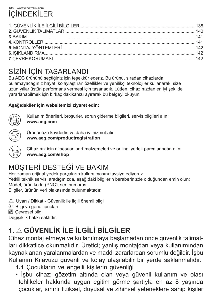 SİZİN İÇİN TASARLANDI Bu AEG ürününü seçtiğiniz için teşekkür ederiz. Bu ürünü, sıradan cihazlarda bulamayacağınız hayatı kolaylaştıran özellikler ve yenilikçi teknolojiler kullanarak, size uzun yıllar üstün performans vermesi için tasarladık. Lütfen, cihazınızdan en iyi şekilde yararlanabilmek için birkaç dakikanızı ayırarak bu belgeyi okuyun. Aşağıdakiler için websitemizi ziyaret edin: Kullanım önerileri, broşürler, sorun giderme bilgileri, servis bilgileri alın: www.aeg.com Ürününüzü kaydedin ve daha iyi hizmet alın: www.aeg.com/productregistration Cihazınız için aksesuar, sarf malzemeleri ve orijinal yedek parçalar satın alın: www.aeg.com/shop