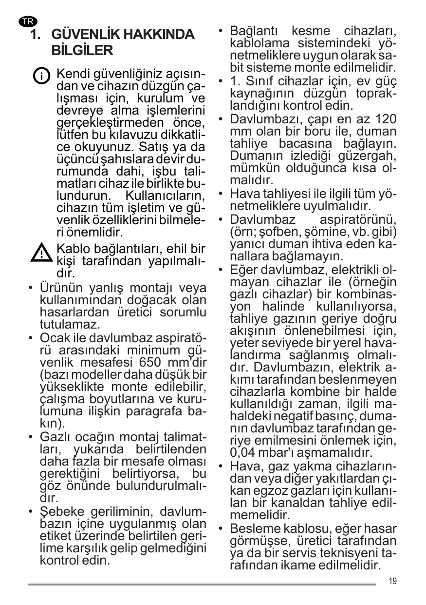 1. SICHERHEITSINFORMA TIONEN Lesen Sie bitte für Ihre eigene Sicherheit und die korrekte Funktion des Geräts diese Betriebsanleitung sorgfältig durch, bevor Sie es installieren und in Betrieb nehmen. Bewahren Sie die Betriebsanleitung stets zusammen mit dem Gerät auf, auch falls Sie dieses verkaufen oder Dritten überlassen. Es ist wichtig, dass die Benutzer mit allen Funktionsund Sicherheitsmerkmalen des Gerätes vertraut sind. Die Kabel müssen von kompetentem Fachpersonal angeschlossen werden. • En aucun cas le fabricant ne peut être tenu pour responsable de dommages éventuellement dus à une installation ou à une utilisation impropre. • La distance de sécurité minimum entre la table de cuisson et la hotte aspirante est de 650 mm (certains modèles peuvent être installés à une hauteur inférieure ; voir le paragraphe concernant les dimensions de travail et l’installation). • Si les instructions d’installation de la table de cuisson à gaz spécifient une distance supérieure à celle indiquée ci-