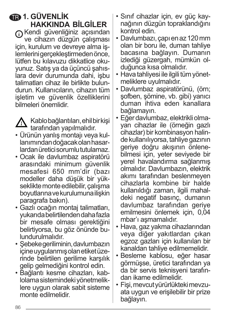 Kablo bağlantıları, ehil bir kişi tarafından yapılmalıdır. Ürünün yanlış montajı veya kullanımından doğacak olan hasarlardan üretici sorumlu tutulamaz. Ocak ile davlumbaz aspiratörü arasındaki minimum güvenlik mesafesi 650 mm’dir (bazı modeller daha düşük bir yükseklikte monte edilebilir, çalışma boyutlarına ve kurulumuna ilişkin paragrafa bakın). Gazlı ocağın montaj talimatları, yukarıda belirtilenden daha fazla bir mesafe olması gerektiğini belirtiyorsa, bu göz önünde bulundurulmalıdır. Şebeke geriliminin, davlumbazın içine uygulanmış olan etiket üzerinde belirtilen gerilime karşılık gelip gelmediğini kontrol edin. Bağlantı kesme cihazları, kablolama sistemindeki yönetmeliklere uygun olarak sabit sisteme monte edilmelidir.