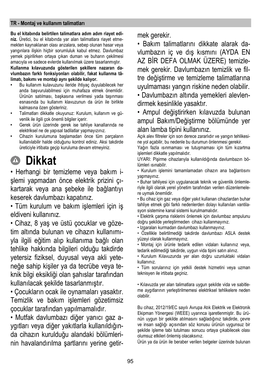 - Elektrik çarpma risklerini önlemek için davlumbaz ampulunu doğru şekilde yerleştirmeden cihazı kullanmayınız.