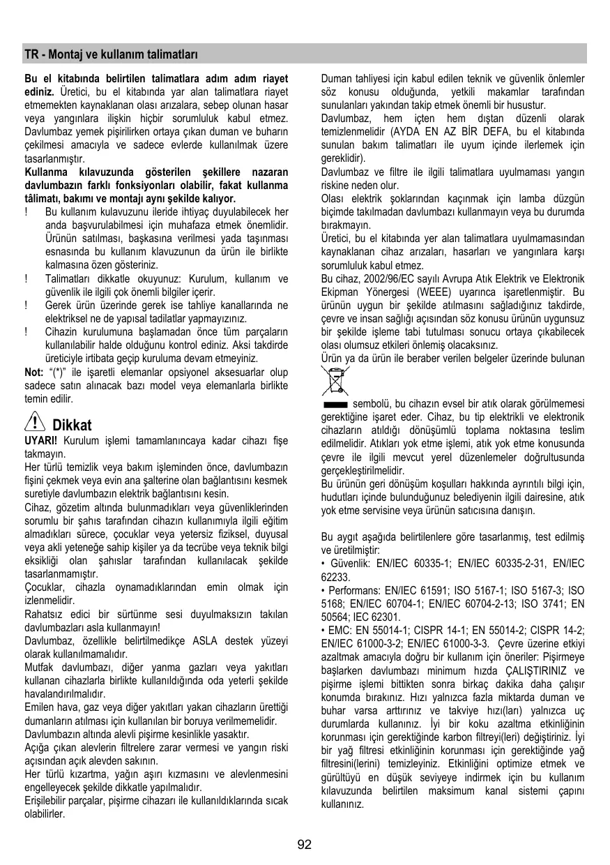 - EMC: EN 55014-1; CISPR 14-1; EN 55014-2; CISPR 14-2; EN/IEC 61000-3-2; EN/IEC 61000-3-3. Çevre üzerine etkiyi azaltmak amaciyla.Doğru bir kullanim icin oneriler: Pisirmeye baslarken davlumbazi minimum hizda ÇALISTIRINIZ ve pişirme islemi bittikten sonra birkac dokdika daha calisir konumda birakiniz. Hizl yalnizca fazla miktarda duman ve buhar varsa arttiriniz ve takviye hizl(lari) yalnizca uc durumlarda kullaniniz. Iyi bir koku azaltma etkinliginin korunması icin gerektiginde karbon filtreyleri(leri) degistiriniz. Iyi bir yapfiltresi etkinliginin korunması icin gerektiginde yap filtresini(lerini) temizleyiniz. Etkinligini optimize etmek ve gürultüyu en)dusuk seviyeYE indirmek icin bu kullanim kulavzunda belirtilen maksimum kanal sistemi capini kullaniniz.
