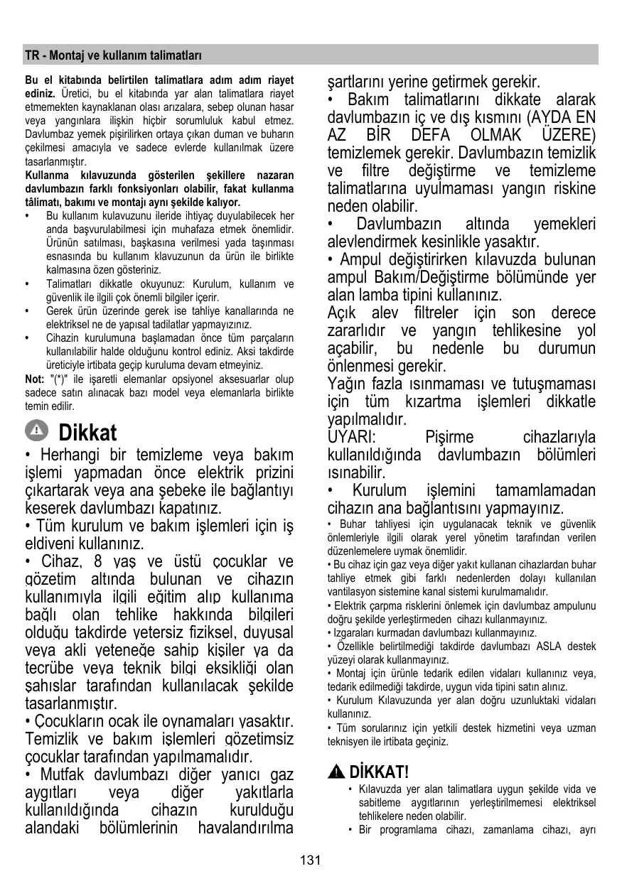 La hotte peut avoir des configurations esthétiques différentes par rapport à ce qui est illustré dans les dessins de ce manuel, cependant les instructions pour l’utilisation, l’entretien et l’installation restent identiques. • Il est important de conserver ce livret pour pouvoir le consulter à tout moment. En cas de vente, de cession ou de déménagement, assurez-vous que la notice d'utilisation l'accompagne. • Veuillez lire attentivement les instructions, vous trouverez des informations importantes sur l'installation, le mode d'emploi et la sécurité. • Ne pas effectuer des modifications électriques ou mécaniques sur le produit ou sur les conduits d’évacuation. • Avant d'installer l'appareil, vérifiez qu’il n’y a aucun composant endommagé. Sinon, contactez votre revendeur et ne continuez pas l'installation. Remarque : Les pièces portant le symbole "(*)" sont des accessoires optionnels fournis uniquement avec certains modèles ou des pièces non fournies, à acheter.