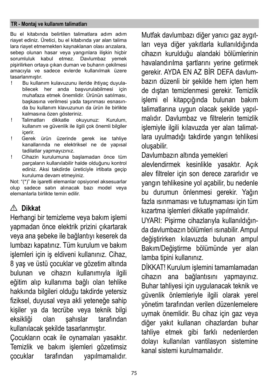 Le constructeur décline toute responsabilité pour tous les inconvénients, dommages ou incendies provoqués à l’appareil et dûs à la non observation des instructions de la présente notice. Cette hotte prévue pour l’aspiration des fumées et vapeurs de cuisson est destinée à un usage domestique exclusivement. ! Il est important de conserver ce livret pour pouvoir le consulter à tout moment. En cas de vente, de cession ou de déménagement, s’assurer qu’il reste avec le produit. ! Lire attentivement les instructions: il y a d’importantes informations sur l’installation, sur l’emploi et sur la sécurité. ! Ne pas effectuer des modifications électriques ou mécaniques sur le produit ou sur les conduit d’évacuation. ! Avant d'installer l'appareil, vérifiez qu’il n’y a aucun composant endommagé. Sinon, contactez votre revendeur et ne pas continuer l'installation. Note: les pièces indiquées avec le symbole “(*)” sont des accessoires optionnels qui sont fournies uniquement avec certains modèles ou des pièces non fournies qui doivent être achetées.