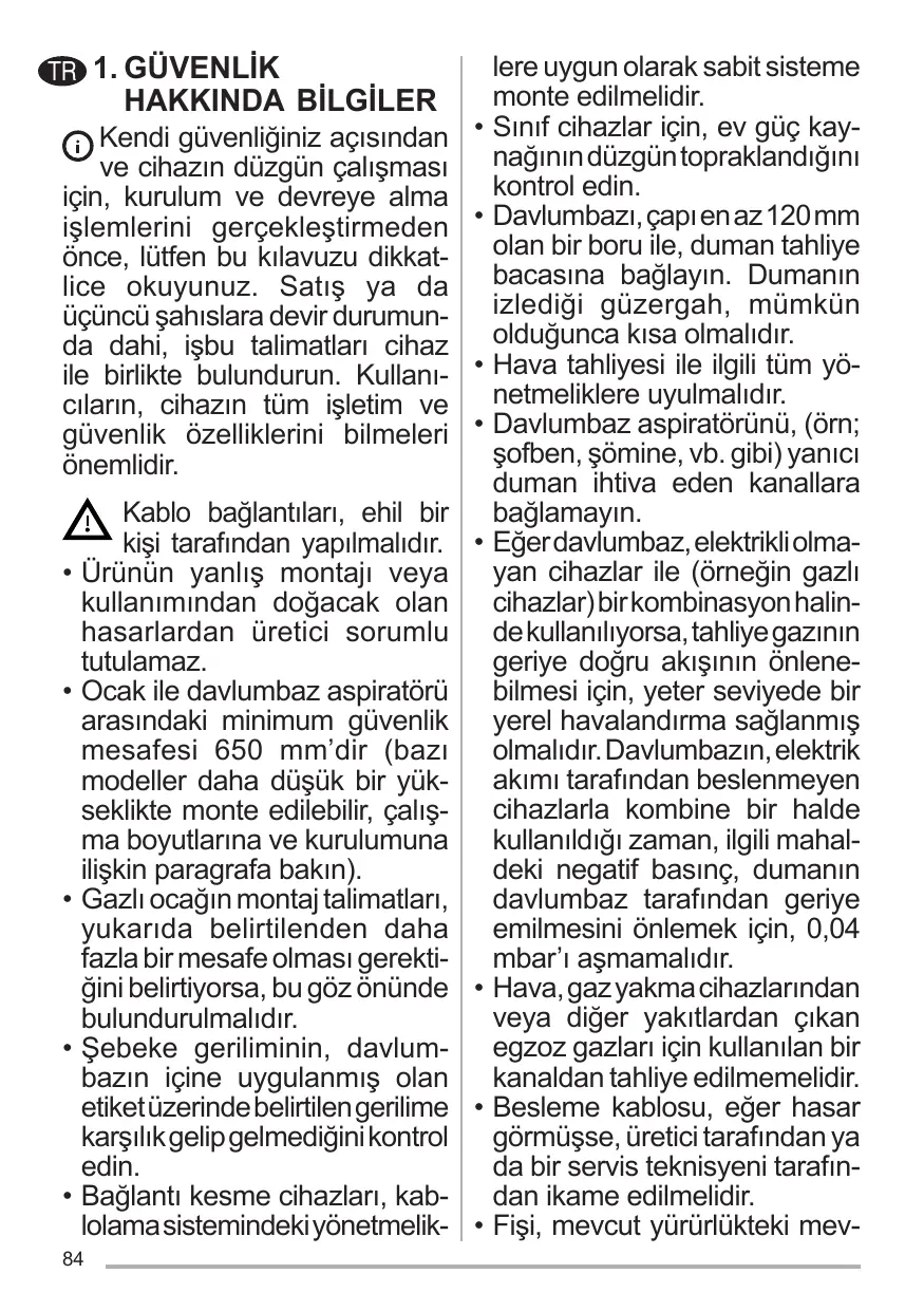 Les dispositifs de sectionnement doivent être montés dans l’installation fixe conformément aux normes sur les systèmes de câblage. Pour les appareils de Classe I, s’assurer que l’installation électrique de votre intérieur dispose d’une mise à la terre adéquate. Reliez l’aspirateur du conduit de cheminée avec un tube ayant un diamètre minimum de 120 mm. Le parcours des fumées doit être le plus court possible. Respecter toutes les normes concernant l’évacuation de l’air. Ne reliez pas la hotte aspirante aux conduits de cheminée qui acheminent les fumées de combustion (par ex. de chaudières, de cheminées, etc.). Si vous utilisez l’aspirateur en même temps que des appareils non électriques (par ex. fonctionnant au gaz), veillez à ce que la pièce soit adéquatement ventilée, afin d’empêcher le retour du flux des gaz d’évacuation. Si vous utilisez la hotte de cuisine en même temps que des appareils non alimentés à l’électricité, la pression négative dans la pièce ne doit pas dépasser 0,04 mbar, afin d’éviter que les fumées soient réaspirées dans la pièce où se trouve la hotte.