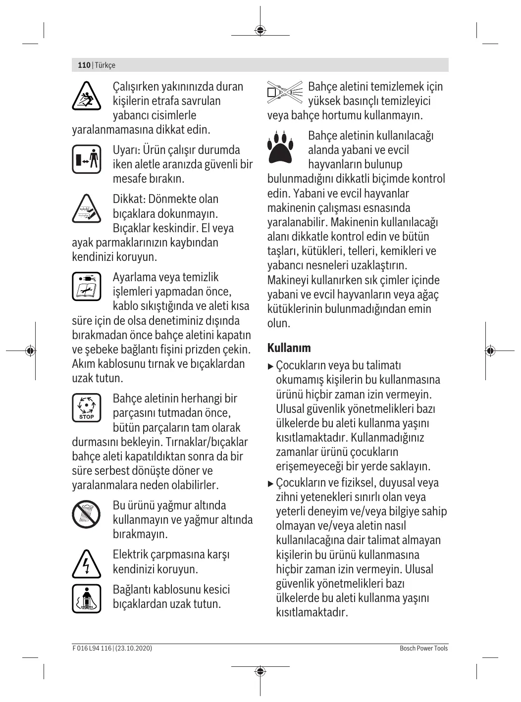 priée de l’outil de jardin. Conserver les instructions d’utilisation à un endroit sûr pour pouvoir les consulter ultérieurement. Explication des symboles se trouvant sur l’outil de jardin Indications générales sur d’éventuels dangers. Lire soigneusement ces instructions d’utilisation. Prendre les précautions nécessaires pour que les personnes se trouvant à proximité ne risquent pas d’être blessées par des projections provenant de l’outil. Avertissement : Maintenir une distance de sécurité quand l’outil de jardin est en marche. Attention : ne touchez pas les lames en rotation. Les lames sont coupantes. Attention à ne pas se faire couper les orteils ou les doigts. Arrêter l’outil de jardin et retirer la fiche de la prise de courant avant d’effectuer des réglages sur l’appareil ou de le nettoyer, lorsque le câble se trouve coincé ou que l’appareil soit laissé sans surveillance même pour une courte durée. Maintenir le câble éloigné des griffes/ lames. Attendre l’arrêt total de tous les éléments de l’outil de jardin avant de les toucher. Bosch Power Tools