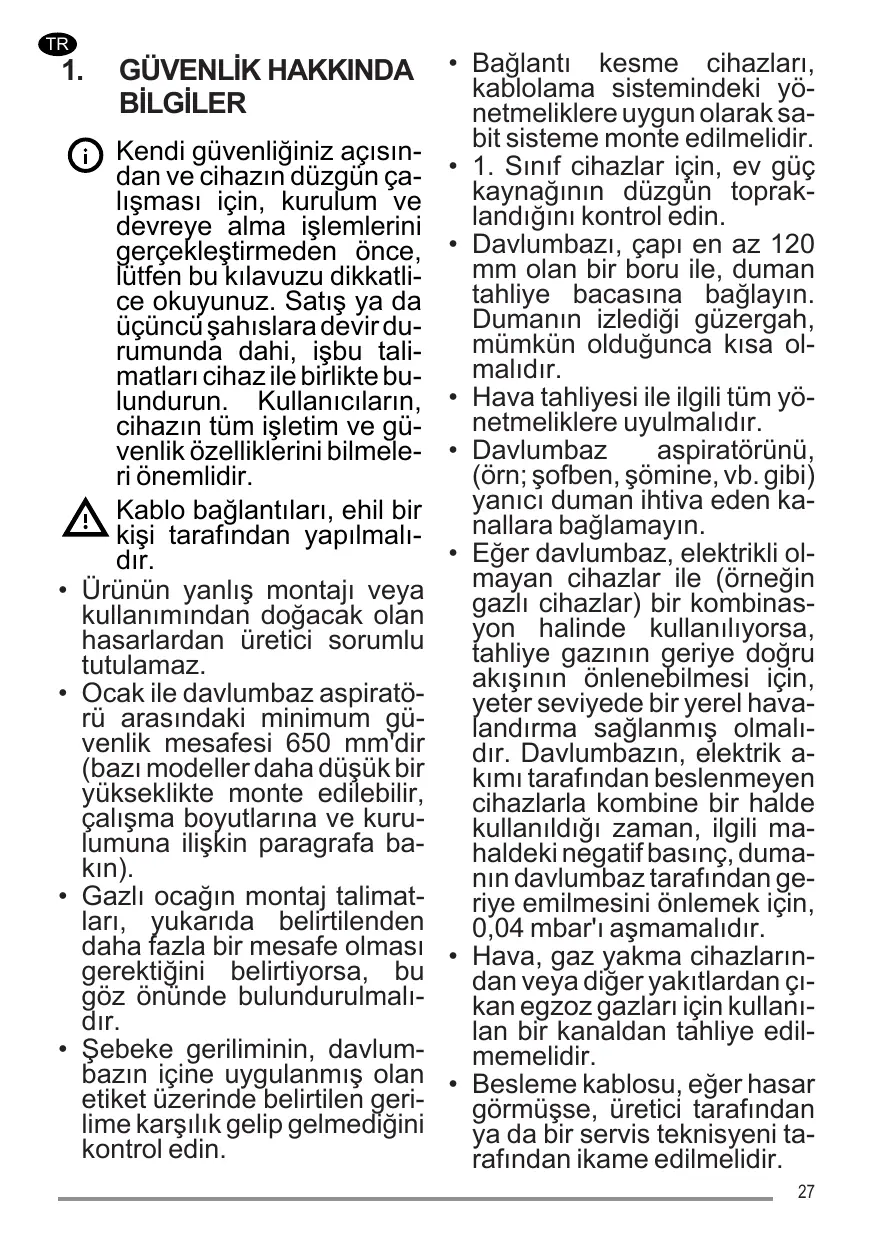 Pour les appareils de Classe I, s’assurer que l’installation électrique de votre intérieur dispose d’une mise à la terre adéquate Relier la hotte au conduit de cheminée avec un tube ayant un diamètre minimum de 120 mm. Le parcours des fumées doit être le plus court possible. Respecter toutes les normes concernant l’évacuation de l’air. Ne pas relier la hotte aspirante aux conduits de cheminée qui acheminent les fumées de combustion (par ex. de chaudières, de cheminées, etc.). Si vous utilisez l’aspirateur en même temps que des appareils non électriques (par ex. appareils à gaz), veillez à ce que la pièce soit adéquatement ventilée, afin d’empêcher le retour du flux des gaz d’évacuation. Si vous utilisez la hotte de cuisine en même temps que des appareils non alimentés à l’électricité, la pression négative dans la pièce ne doit pas dépasser 7