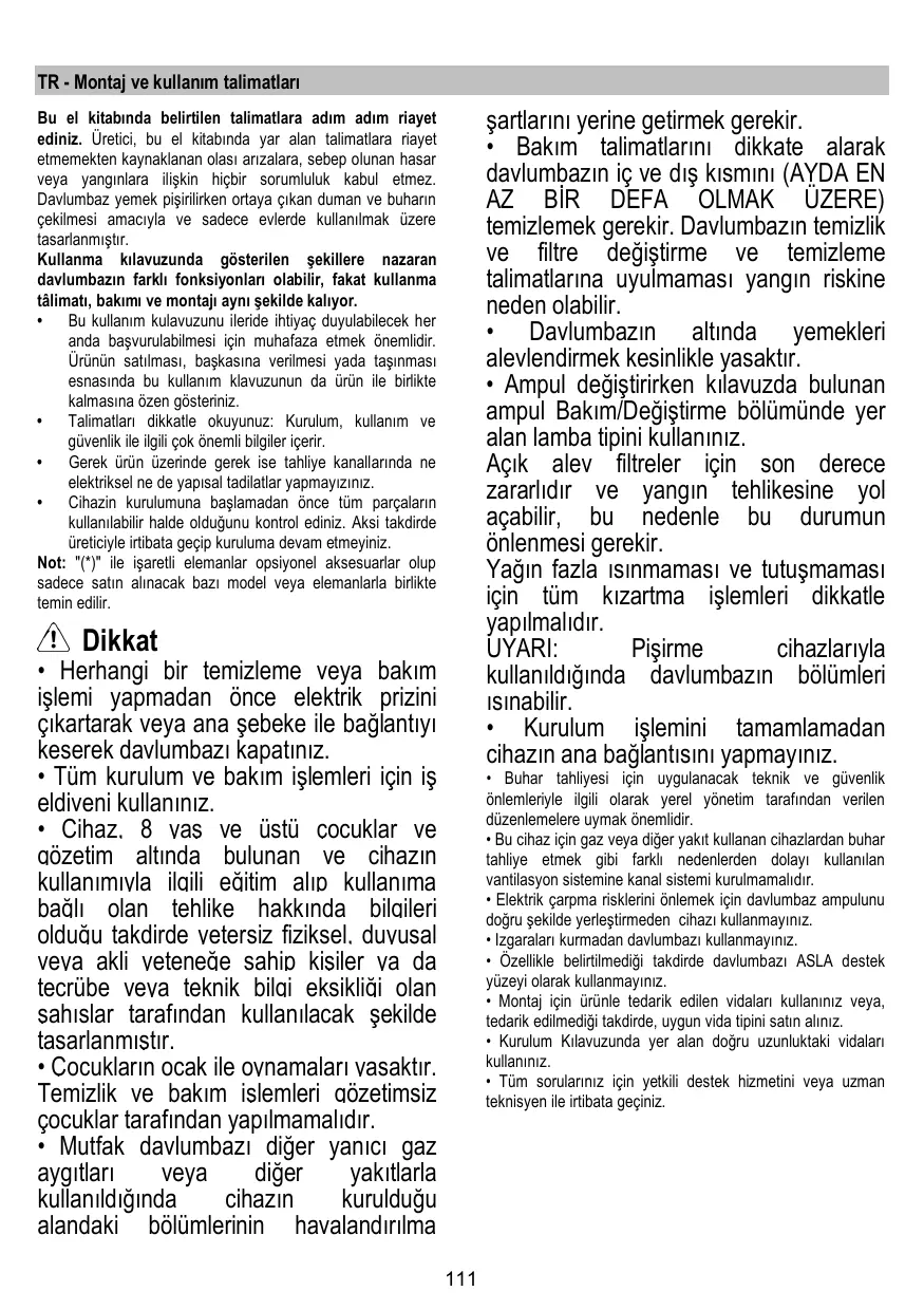 Bu el kitabında belirtilen talimatlara adım adım riayet ediniz. Üretici, bu el kitabında yar alan talimatlara riayet etmemekten kaynaklanan olası arızalara, sebep olunan hasar veya yangınlara ilişkin hiçbir sorumluluk kabul etmez. Davlumbaz yemek pişirilirken ortaya çıkan duman ve buharın çekilmesi amacıyla ve sadece evlerde kullanılmak üzere tasarlanmıştır. Kullanma kılavuzunda gösterilen şekillere nazaran davlumbazın farklı fonksiyonları olabilir, fakat kullanma tâlimatı, bakımı ve montajı aynı şekilde kalıyor. • Bu kullanım kulavuzunu ileride ihtiyaç duyulabilecek her anda başvurulabilmesi için muhafaza etmek önemlidir. Ürünün satılması, başkasına verilmesi yada taşınması esnasında bu kullanım klavuzunun da ürün ile birlikte kalmasına özen gösteriniz. • Talimatları dikkatle okuyunuz: Kurulum, kullanım ve güvenlik ile ilgili çok önemli bilgiler içerir. • Gerek ürün üzerinde gerek ise tahliye kanallarında ne elektriksel ne de yapısal tadilatlar yapmayızınız. • Cihazin kurulumuna başlamadan önce tüm parçaların kullanılabilir halde olduğunu kontrol ediniz. Aksi takdirde üreticiyle irtibata geçip kuruluma devam etmeyiniz. Not: "(*)" ile işaretli elemanlar opsiyonel aksesuarlar olup sadece satın alınacak bazı model veya elemanlarla birlikte temin edilir.
