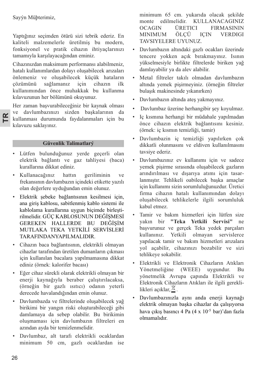 Ne jamais laisser les brûleurs à gaz allumés sans placer un récipient dessus. La graisse accumulée dans les filtres peut dégoutter ou s'enflammer à cause de l'augmentation de température. Éviter de faire la cuisine sous la hotte si les filtres métalliques ne se trouvent pas à leur place, par exemple; pendant qu'ils sont nettoyés dans le lave-vaisselle. Il est interdit de flamber sous la hotte. Ne mettez pas d´objets au-dessus la hotte. Débrancher l'appareil avant de faire n'importe quelle manipulation à l'intérieur de ce dernier ; par exemple, pendant le nettoyage ou l'entretien. Nous vous recommandons d'utiliser des gants et de prendre toutes les précautions nécessaires au moment de nettoyer l'intérieur de la hotte. La hotte est destinée à l'usage domestique et exclusivement à l'extraction et à la purification des gaz produits par la préparation d'aliments. L'utilisation à d'autres fins est sous votre entière responsabilité et peut être dangereuse. Le fabricant ne se responsabilise pas des dommages causés par une mauvaise utilisation de l'appareil. Pour tout type de réparation, veuillez vous adresser au Service d'Assistance Technique de TEKA le plus proche, et utiliser toujours des pièces de rechange originales. Les réparations ou modifications réalisées par un personnel non qualifié peuvent causer des dommages à l'appareil ou peuvent entraîner un mauvais fonctionnement et peuvent même mettre en danger votre propre sécurité. Cet appareil respecte la directive européenne 2002/96/CE relative aux appareils électriques et électroniques usagés “Waste Electrical and Electronic Equipment” (WEEE). La directive définit le cadre pour une reprise et une récupération des appareils usagés applicables dans les pays de la CE, . Lorsqu´on met en marche la hotte en même temps que d´autres appareils alimentés par une énergie autre qu´électrique, la sortie d´air ne doit pas être supérieure à 4Pa (4 x 10-5 bar).