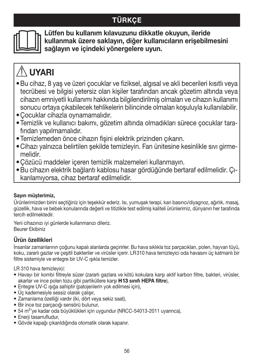 UYARI Solunum yollarında veya akciğerlerinizde ciddi bir rahatsızlığınız varsa, hava temizleyiciyi kullanmadan önce doktorunuza danışın. Cihazı sadece geliştirilme amacına uygun ve bu kullanım kılavuzunda belirtilen şekilde kullanın. Amacına uygun olmayan her türlü kullanım tehlikeli olabilir. Nizami olmayan ve dikkatsiz kullanımdan ötürü oluşacak hasarlardan üretici firma sorumlu değildir.