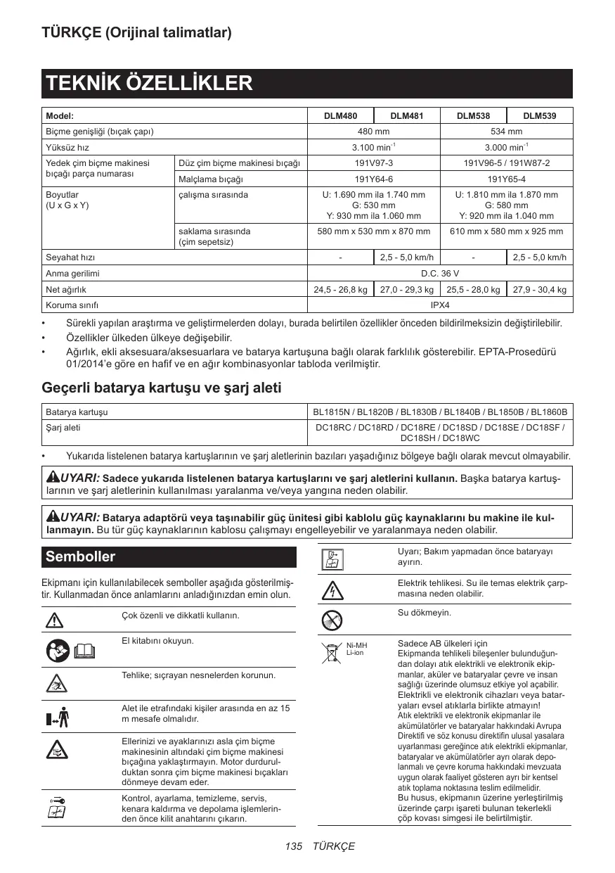 Gürültü Tipik A-ağırlıklı gürültü düzeyi (EN60335-2-77 standardına göre belirlenen): Model DLM480 Ses basınç seviyesi (Lp A) : 84 d B ( A) Ses gücü düzeyi (LW A) : 92 d B ( A) Belirsizlik (K): 3 dB (A) Model DLM481 Ses basınç seviyesi (Lp A) : 84 d B ( A) Ses gücü düzeyi (LW A) : 92 d B ( A) Belirsizlik (K): 3 dB (A) Model DLM538 Ses basınç seviyesi (Lp A) : 85 d B ( A) Ses gücü düzeyi (LW A) : 96 d B ( A) Belirsizlik (K): 3 dB (A) Model DLM539 Ses basınç seviyesi (Lp A) : 85 d B ( A) Ses gücü düzeyi (LW A) : 96 d B ( A) Belirsizlik (K): 3 dB (A) NOT: Beyan edilen gürültü emisyonu değer(ler)i bir standart test yöntemine uygun şekilde ölçülmüştür ve bir aleti bir başkasıyla karşılaştırmak için kullanılabilir. NOT: Beyan edilen gürültü emisyonu değer(ler) i bir ön maruz kalma değerlendirmesi olarak da kullanılabilir.