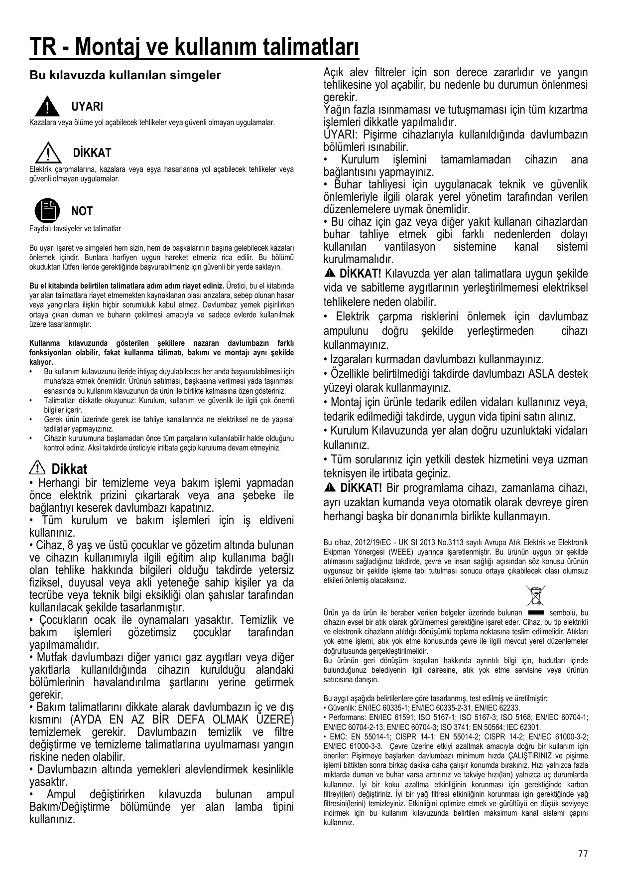 Ürün ya da ürün ile beraber verilen belgeler üzerinde bulunan sembolü, bu cihazın evsel bir atık olarak görülmemesi gerektiğine işaret eder. Cihaz, bu tip elektrikli ve elektronik cihazların atıldığı dönüşümlü toplama noktasına teslim edilmelidir. Atıkları yok etme işlemi, atık yok etme konusunda çevre ile ilgili mevcut yerel düzenlemeler doğrultusunda gerçekleştirilmelidir. Bu ürünün geri dönüşüm koşulları hakkında ayrıntılı bilgi için, hudutları içinde bulunduğunuz belediyenin ilgili dairesine, atık yok etme servisine veya ürünün satıcısına danışın. Bu aygıt aşağıda belirtilenlere göre tasarlanmış, test edilmiş ve üretilmiştir: • Güvenlik: EN/IEC 60335-1; EN/IEC 60335-2-31, EN/IEC 62233. • Performans: EN/IEC 61591; ISO 5167-1; ISO 5167-3; ISO 5168; EN/IEC 60704-1; EN/IEC 60704-2-13; EN/IEC 60704-3; ISO 3741; EN 50564; IEC 62301. • EMC: EN 55014-1; CISPR 14-1; EN 55014-2; CISPR 14-2; EN/IEC 61000-3-2; EN/IEC 61000-3-3. Çevre üzerine etkiyi azaltmak amacıyla doğru bir kullanım için öneriler: Pişirmeye başlarken davlumbazı minimum hızda ÇALIŞTIRINIZ ve pişirme işlemi bittikten sonra birkaç dakika daha çalışır konumda bırakınız. Hızı yalnızca fazla miktarda duman ve buhar varsa arttırınız ve takviye hızı(ları) yalnızca uç durumlarda kullanınız. İyi bir koku azaltma etkinliğinin korunması için gerektiğinde karbon filtreyi(leri) değiştiriniz. İyi bir yağ filtresi etkinliğinin korunması için gerektiğinde yağ filtresini(lerini) temizleyiniz. Etkinliğini optimize etmek ve gürültüyü en düşük seviyeye indirmek için bu kullanım kılavuzunda belirtilen maksimum kanal sistemi çapını kullanınız.