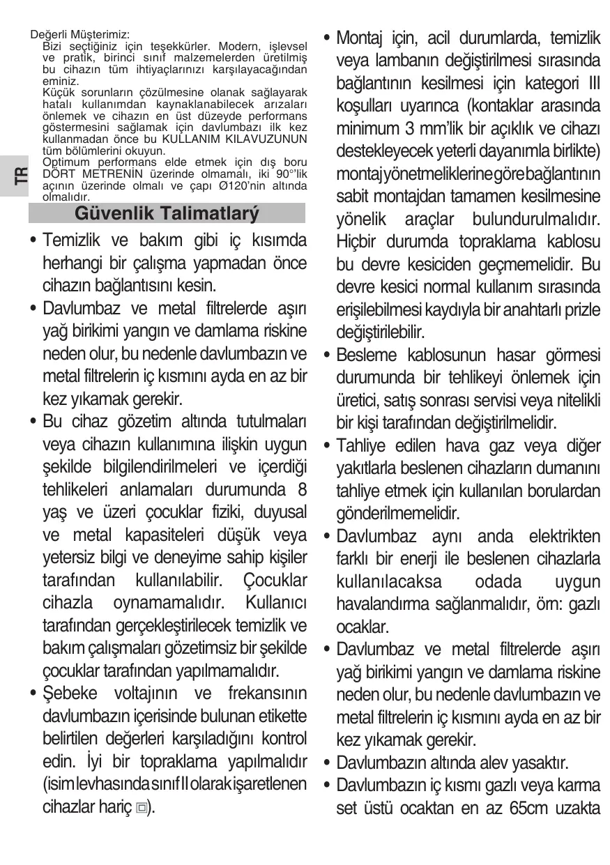 • Évitez de cuisiner sous la hotte sans les filtres métalliques, par exemple pendant qu’ils sont lavés dans le lave-vaisselle. • Nous vous conseillons d’utiliser des gants et de porter une attention particulière pendant le nettoyage de l’intérieur de la hotte. • Votre hotte est destinée à un usage domestique et uniquement pour l’extraction et la purification des gaz en provenance de la préparation d’aliments. Une utilisation différente pourrait être dangereuse et vous en serez totalement responsable. Le fabricant ne répond pas en cas de dommage causé par un usage incorrect de l’appareil. • Si vous avez besoin d’une réparation, vous devrez contacter le Service d’Assistance Technique du fabricant le plus proche et n’utiliser que des rechanges originaux.
