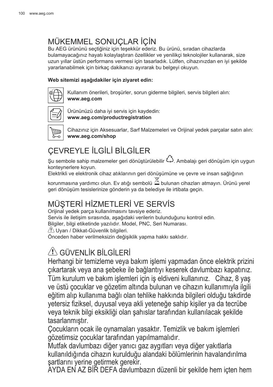Bu AEG urunun seştiniz icin teşkkür ederiz. Bu urunu, siradan cihazlarda bulamayacınüz hayati kolaylşiran özellikler ve yenilicki teknojiler kullanarak, size uzun yllar üstün performans vermesi icin tasarladık. Lüftfen, cihazınizdan en iyi sekilde yararlanabilmek icin birkaç dokanı ayirarak bu belgeyi okuyun.