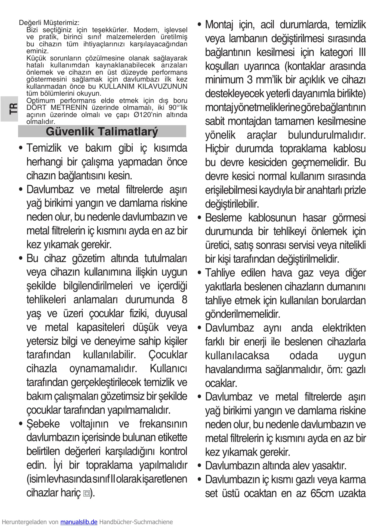 • Évitez de cuisiner sous la hotte sans les filtres métalliques, par exemple pendant qu’ils sont lavés dans le lave-vaisselle. • Nous vous conseillons d’utiliser des gants et de porter une attention particulière pendant le nettoyage de l’intérieur de la hotte. • Votre hotte est destinée à un usage domestique et uniquement pour l’extraction et la purification des gaz en provenance de la préparation d’aliments. Une utilisation différente pourrait être dangereuse et vous en serez totalement responsable. Le fabricant ne répond pas en cas de dommage causé par un usage incorrect de l’appareil. • Si vous avez besoin d’une réparation, vous devrez contacter le Service d’Assistance Technique du fabricant le plus proche et n’utiliser que des rechanges originaux.