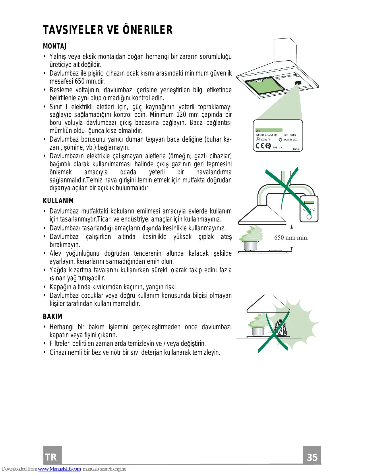 - Davlumbaz ile pişirici cihazιn ocak kιsmι arasιndaki minimum güvenlik mesafesi 650 mm.dir.