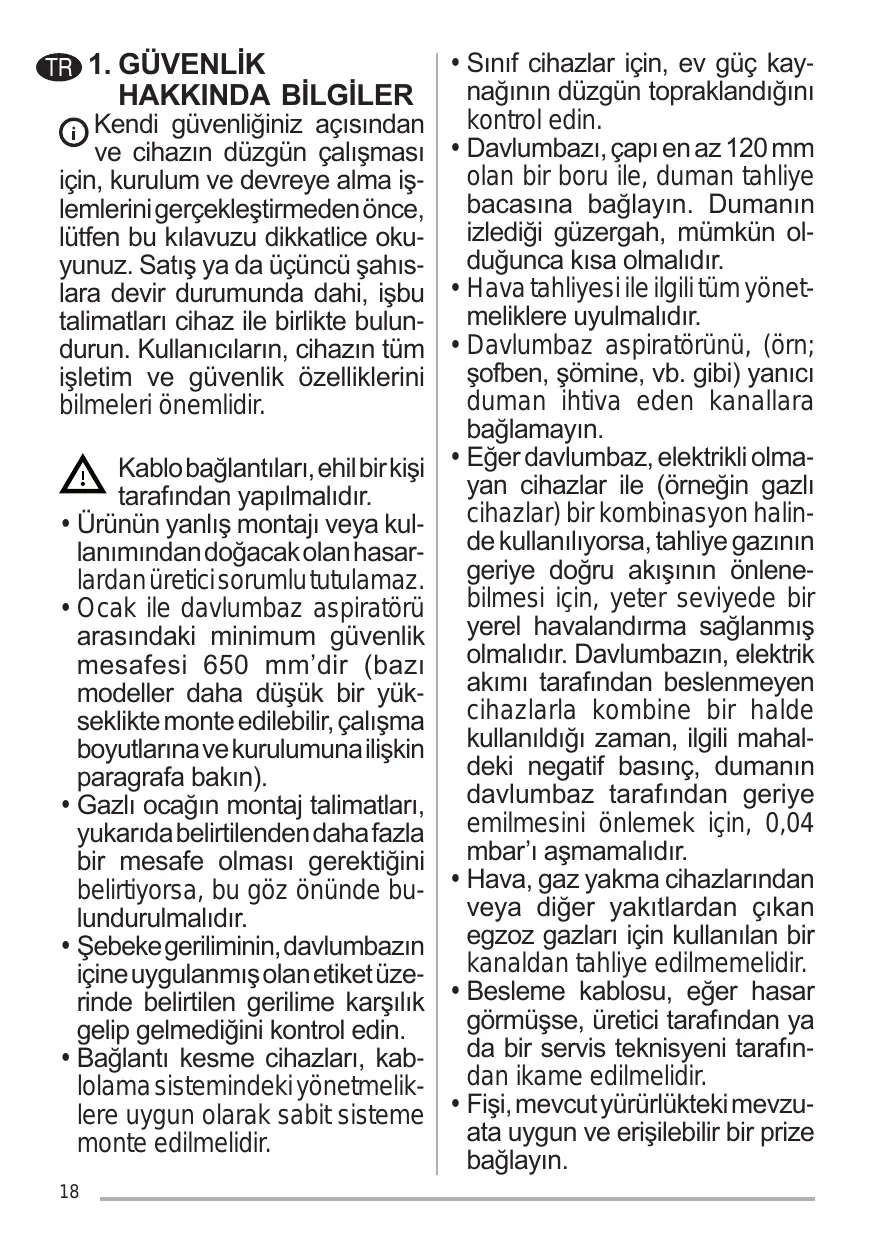 Les dispositifs de sectionnement doivent être montés dans l’installation fixe conformément aux normes sur les systèmes de câblage. Pour les appareils de Classe I, s’assurer que l’installation électrique de votre intérieur dispose d’une mise à la terre adéquate. Reliez l’aspirateur du conduit de cheminée avec un tube ayant un diamètre minimum de 120 mm. Le parcours des fumées doit être le plus court possible. Respecter toutes les normes concernant l’évacuation de l’air. Ne reliez pas la hotte aspirante aux conduits de cheminée qui acheminent les fumées de combustion (par ex. de chaudières, de cheminées, etc.). Si vous utilisez l’aspirateur en même temps que des appareils non électriques (par ex. fonctionnant au gaz), veillez à ce que la pièce soit adéquatement ventilée, afin d’empêcher le retour du flux des gaz d’évacuation. Si vous utilisez la hotte de cuisine en même temps que des appareils non alimentés à l’électricité, la pression négative dans la pièce ne doit pas dépasser 0,04 mbar, afin d’éviter que les fumées