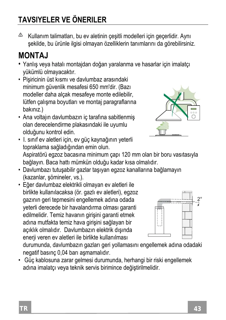 à celle indiquée sur la plaque des données appliquée à l’intérieur de la hotte. Pour les appareils de Classe I, s’assurer que l’installation électrique de votre intérieur dispose d’une mise à la terre adéquate. Relier l’aspirateur au conduit de cheminée avec un tube d’un diamètre minimum de 120 mm. Le parcours des fumées doit être le plus court possible. Ne pas relier la hotte aspirante aux conduits de cheminée qui acheminent les fumées de combustion (par exemple de chaudières, de cheminées, etc.). Si vous utilisez l’aspirateur en combinaison avec des appareils non électriques (par ex. appareils à gaz), vous 2° devez garantir un degré d’aération suffisant dans la pièce, afin d’empêcher le retour du flux des gaz de sortie. La cuisine doit présenter une ouverture communiquant directement vers l’extérieur pour garantir l’amenée d’air propre. Si vous utilisez la hotte de cuisine en combinaison avec des appareils non alimentés à l’électricité, la pression négative dans la pièce ne doit pas dépasser 0,04 mbar afin d’éviter que la hotte ne réaspire les fumées dans la pièce. Si le cordon d’alimentation est endommagé, veuillez le faire remplacer par le fabricant ou par un service après-vente agréé pour éviter tout risque d’accident.