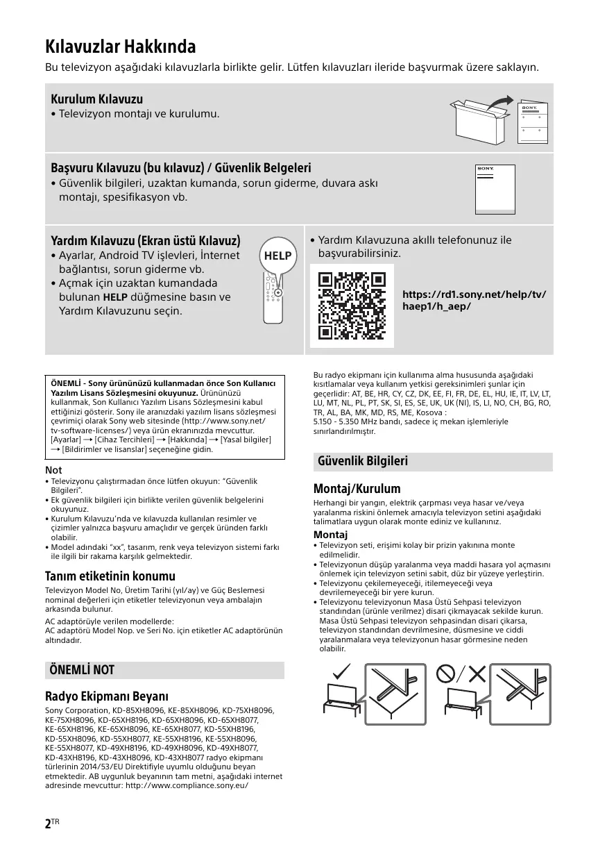 • Model adındaki “xx”, tasarım, renk veya televizyon sistemi farkı ile ilgili bir rakama karşılık gelmektedir. Tanım etiketinin konumu Televizyon Model No, Üretim Tarihi (yıl/ay) ve Güç Beslemesi nominal değerleri için etiketler televizyonun veya ambalajın arkasında bulunur. AC adaptörüyle verilen modellerde: AC adaptörü Model Nop. ve Seri No. için etiketler AC adaptörünün altındadır. ÖNEMLİ NOT Radyo Ekipmanı Beyanı Sony Corporation, KD-85XH8096, KE-85XH8096, KD-75XH8096, KE-75XH8096, KD-65XH8196, KD-65XH8096, KD-65XH8077, KE-65XH8196, KE-65XH8096, KE-65XH8077, KD-55XH8196, KD-55XH8096, KD-55XH8077, KE-55XH8196, KE-55XH8096, KE-55XH8077, KD-49XH8196, KD-49XH8096, KD-49XH8077, KD-43XH8196, KD-43XH8096, KD-43XH8077 radyo ekipmanı türlerinin 2014/53/EU Direktifiyle uyumlu olduğunu beyan etmektedir. AB uygunluk beyanının tam metni, aşağıdaki internet adresinde mevcuttur: http://www.compliance.sony.eu/ 2TR