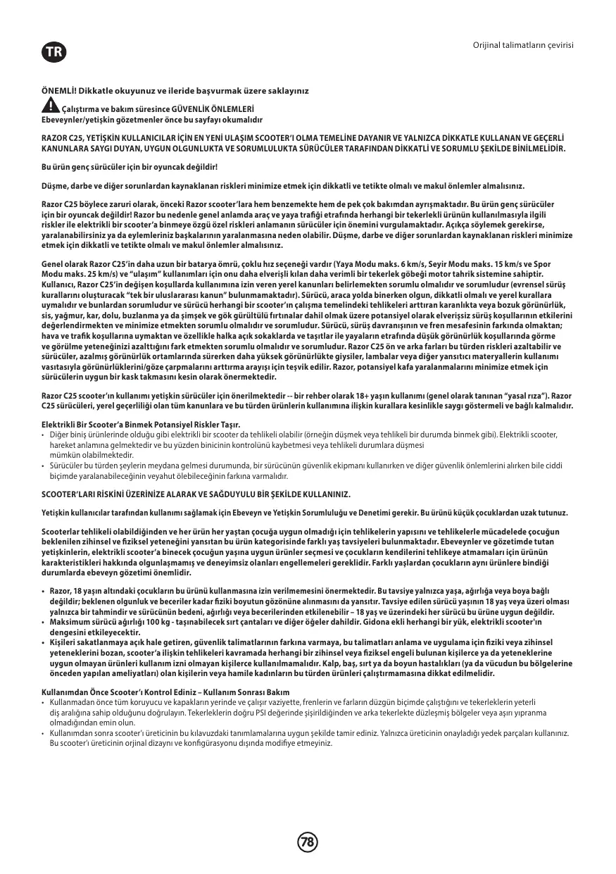 Ce produit n’est pas un jouet pour jeunes utilisateurs ! Vous devez être prudent, attentif et prendre des précautions raisonnables pour réduire au minimum les risques de chute, d’accident ou autres problèmes. Le Razor C25 est donc nécessairement à la fois comparable, mais par beaucoup d’aspects, différent des précédents scooters Razor. Ce produit n’est pas un jouet pour jeunes utilisateurs ! Razor souligne donc l’importance pour les utilisateurs de bien comprendre les risques associés à l’utilisation de quasiment tout produit à roues près de la circulation des véhicules ou des piétons ainsi que les risques spécifiques à conduire un scooter électrique. Pour le dire brutalement, vous pourriez être blessé et vos actions pourraient causer des blessures à d’autres. Vous devez être prudent, attentif et prendre des précautions raisonnables pour réduire au minimum les risques de chute, d’accident ou autres problèmes. Pour l’essentiel, le Razor C25 a une autonomie sur batterie supérieure, plusieurs options de vitesse (Mode piéton jusqu’à 6 km/h, Mode croisière jusqu’à 15 km/h (9,3 mph) et Mode sport jusqu’à 25 km/h (15,5 mph)), et un système de propulsion à moteur dans le moyeu plus efficace qui le destine plus aux usages de « trajet domicile-travail ». L’utilisateur doit être et est de toute façon responsable de la vérification de la possibilité d’utiliser le Razor C25 dans diverses circonstances d’après les lois locales (il n’y a pas de « loi internationale uniforme » actuellement pour définir des conditions d’utilisation universelles). Le conducteur doit être et est de toute façon responsable d’agir de façon raisonnée, prudente et dans le respect des règles du code de la route local pendant la conduite, et ce conducteur doit être et est de toute façon responsable de l’évaluation et de la prise en compte des conditions de conduite potentiellement néfastes, notamment conditions d’éclairage ou de visibilité insuffisantes, brouillard, pluie, neige, grêle, verglas ou orages à éclairs, qui augmentent les dangers inhérents à l’utilisation de tout scooter. Le conducteur doit être et est de toute façon responsable de l’ajustement de son comportement de conduite et de sa distance de freinage en fonction des conditions météorologiques et de circulation, ainsi que de prendre en compte la diminution des possibilités de voir et être vu par faible visibilité, en particulier sur route publique et près de véhicules ou de piétons. Les feux avant et arrière du Razor C25 peuvent réduire ces risques, et les utilisateurs sont aussi encouragés à améliorer leur visibilité ou leur signalisation par des vêtements à haute visibilité, des feux ou autres éléments réfléchissants pour conduire par visibilité réduite. Razor recommande aussi absolument à tout utilisateur de porter un casque approprié pour limiter les blessures potentielles à la tête. L’utilisation du scooter Razor C25 est recommandée aux conducteurs adultes -- avec un âge conseillé de plus de 18 ans (généralement considéré comme un âge de « consentement juridique »). Les utilisateurs du Razor C25 doivent assurément respecter et adopter toutes les lois et règles applicables localement à l’utilisation de ces produits. L’utilisation d’une trottinette électrique présente des risques potentiels. • Comme tout autre produit mobile, une trottinette électrique peut être dangereuse (par exemple, on peut tomber ou être confronté à une situation dangereuse). Il va de soi que les trottinettes électriques sont conçues pour se déplacer; il est donc possible que l’utilisateur perde la maîtrise ou soit confronté à des situations dangereuses. • Les utilisateurs doivent comprendre que si une telle situation se présente, un utilisateur peut subir des blessures graves, voire mortelles, même s’il utilise l’équipement de sécurité et qu’il respecte les autres précautions de sécurité. UTILISER LES TROTTINETTES À VOS PROPRES RISQUES ET FAIRE PREUVE DE BON SENS. La présence d’un parent ou d’un adulte responsable est indispensable pour s’assurer de l’utilisation par des conducteurs novices. Conserver ce produit hors de portée des enfants. Parce que les trottinettes peuvent être dangereuses et que tout produit n’est pas approprié aux enfants de tout âge ou de toute taille, il existe différentes recommandations relatives à l’âge dans cette catégorie de produits, qui ont pour but de refléter la nature des dangers et les capacités physiques ou mentales prévues, ou les deux, qu’un enfant possède pour faire face aux dangers. Les parents et les adultes chargés de surveiller les enfants doivent choisir des produits mobiles adaptés à l’âge de l’enfant qui utilisera la trottinette électrique et prendre les précautions afin d’éviter que les enfants trop immatures ou inexpérimentés pour les caractéristiques d’un produit se mettent en danger. Une supervision par les parents est essentielle quand des enfants d’âge différent peuvent avoir accès à ces produits. • La société Razor recommande que l’usage de ce produit ne soit pas permis aux enfants âgés de moins de 18 ans. Cette recommandation est fondée non, tout simplement, sur l’âge, le poids ou la taille ; mais elle reflète la prise en compte de la maturité attendue ainsi que l’aspect physique. L’âge recommandé de 18 ans ou plus est seulement une estimation, et il peut être affecté par la taille, le poids ou les capacités de l’utilisateur. - ce produit ne sera pas considéré comme convenant, d’emblée, pour chaque enfant âgé de 18 ans. • Poids maximal du conducteur 100 kg – y compris sacs à dos et autres articles pouvant être transportés. Toute charge fixée au guidon dégrade la stabilité du scooter électrique. • Toute personne présentant des problèmes mentaux ou physiques 