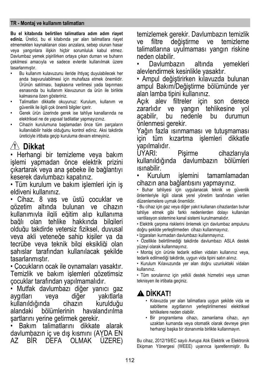 Bu el kitabinda belirtilen talimatlara adim adim riayet ediniz. Uretici, bu el kitabinda yar alan talimatlara riayet etmemekten kaynaklanan olasi arizalara, sebeb olunan hasar veya yangirolara iliskin hiçbir sorumluluk kabul etmez. Davlumbaz yemek pisirilirken ortaya Çkan duman ve buharin减免lmesi amaciyla ve sadece evlerde kullanimak üzere tasarlanmistir.