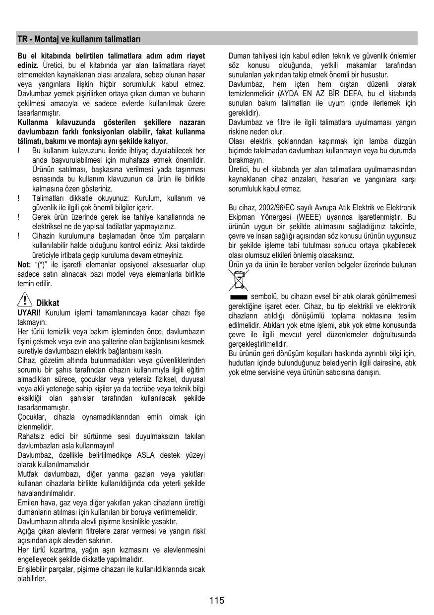 Attention! Ne pas raccorder l’appareil au circuit électrique avant que le montage ne soit complètement terminé. Avant toute opération de nettoyage ou d’entretien, débrancher la hotte du circuit électrique en retirant la prise ou en coupant l’interrupteur général de l’habitation. Munissez-vous de gants de travail avant d’effectuer toute opération d’installation et d’entretien. L’appareil n’est pas destiné à une utilisation par des enfants ou des personnes à capacités physiques, sensorielles ou mentales réduites et sans expérience et connaissance à moins qu’ils ne soient sous la supervision ou formés sur l’utilisation de l’appareil par une personne responsable de leur sécurité. Les enfants doivent être surveillés afin qu’ils ne jouent pas avec l’appareil. Ne jamais utiliser la hotte sans que la grille ne soit montée correctement! La hotte ne doit JAMAIS être utilisée comme plan pour déposer quelque chose sauf si cela est expressément indiqué. Quand la hotte est utilisée en même temps que d’autres appareils à combustion de gaz ou d’autres combustibles, le local doit disposer d’une ventilation suffisante. L’air aspiré ne doit jamais être envoyé dans un conduit utilisé pour l’évacuation des fumées produites par des appareils à combustion de gaz ou d’autres combustibles. Il est formellement interdit de faire flamber les aliments sous la hotte.
