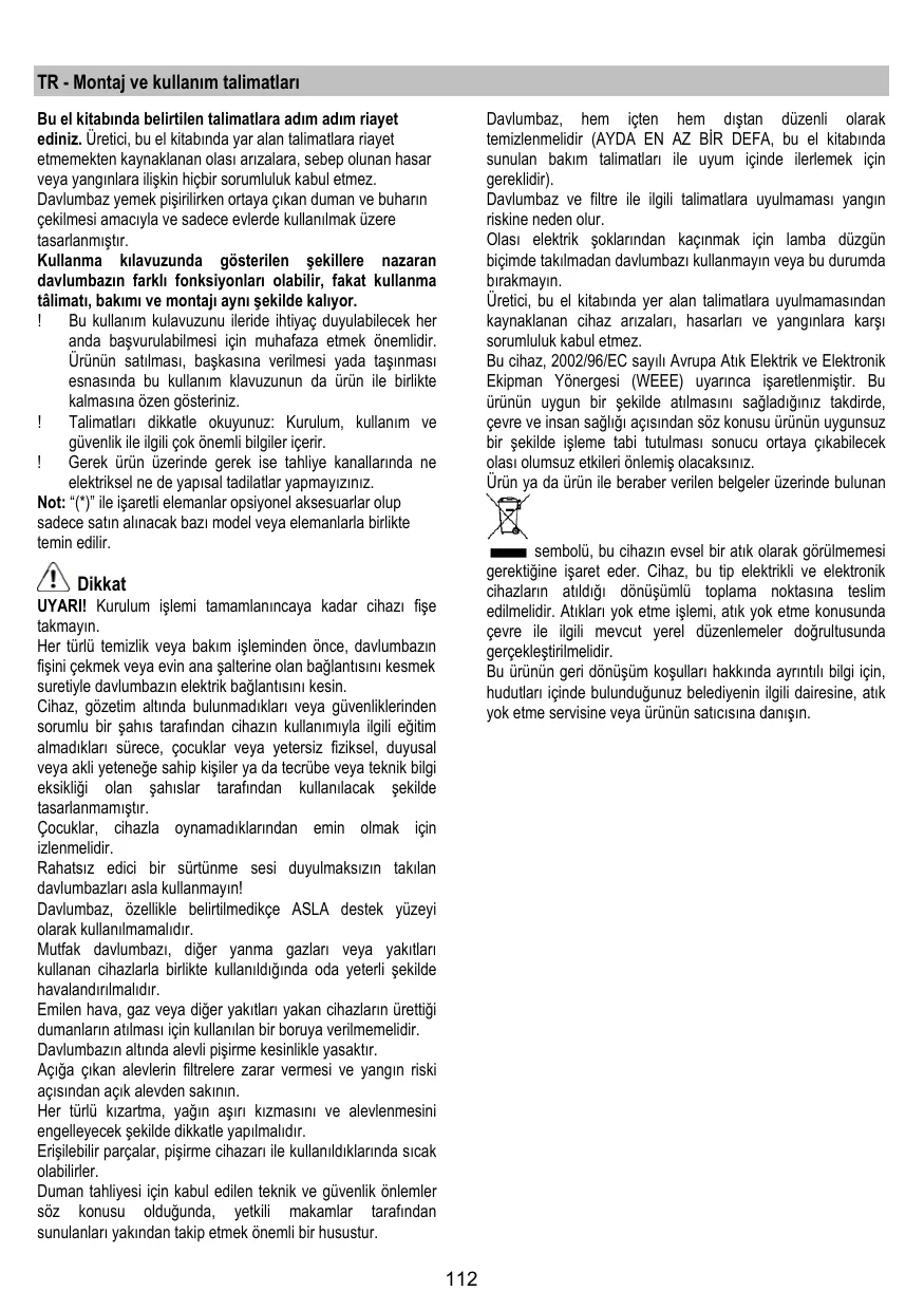 MUTFAK davlumbazi, dijer yanma gazlar vya yakllar kullanan cihazlarla birlikte kullanildiginda oda yeterli sekilde havalandirilmaldir.