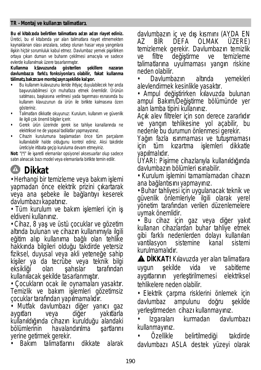 Cet appareil est destiné à être utilisé dans des applications domestiques et analogues telles que : - des coins cuisines réservés au personnel dans des magasins, bureaux et autres environnements professionnels ; - des fermes ; - l’utilisation par les clients des hôtels, motels et autres environnements à caractère résidentiel ; - des environnements du type chambre d’hôtes. La hotte peut avoir des configurations esthétiques différentes par rapport à ce qui est illustré dans les dessins de ce manuel, cependant les instructions pour l’utilisation, l’entretien et l’installation restent identiques. • Il est important de conserver ce livret pour pouvoir le consulter à tout moment. En cas de vente, de cession ou de déménagement, assurez-vous que la notice d'utilisation l'accompagne. • Veuillez lire attentivement les instructions, vous trouverez des informations importantes sur l'installation, le mode d'emploi et la sécurité. • Ne pas effectuer des modifications électriques ou mécaniques sur le produit ou sur les conduits d’évacuation. • Avant d'installer l'appareil, vérifiez qu’il n’y a aucun composant endommagé. Sinon, contactez votre revendeur et ne continuez pas l'installation. Remarque : Les pièces marquées du symbole « (*) » sont des accessoires en option fournis uniquement avec certains modèles, ou des pièces non fournies, à acheter.