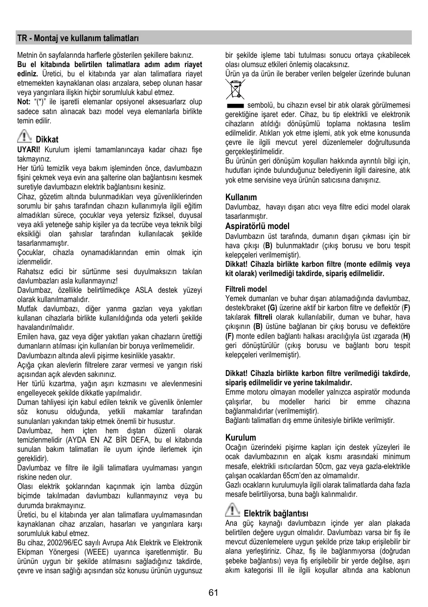 Dans l’éventualité où il ne serait pas possible d’évacuer les fumées et les vapeurs de cuisson vers l’extérieur, il est possible d’utiliser la hotte dans la version recylcage, en effectuant le montage d’un filtre à charbon actif et d’un déflecteur F sur le support (bride) G. Les fumées et les vapeurs sont recyclées à travers le grillage supérieur H, au moyen d’un tuyau d’évacuation connecté à la sortie d’air supérieure B et à la bague de connexion montée sur le déflecteur F (tuyau d’évacuation et colliers de fixation non fournis). Attention! Si la hotte est livrée sans filtre à charbon, celuici doit être commandé et monté avant la mise en service. Les modèles sans moteur d’aspiration fonctionnent