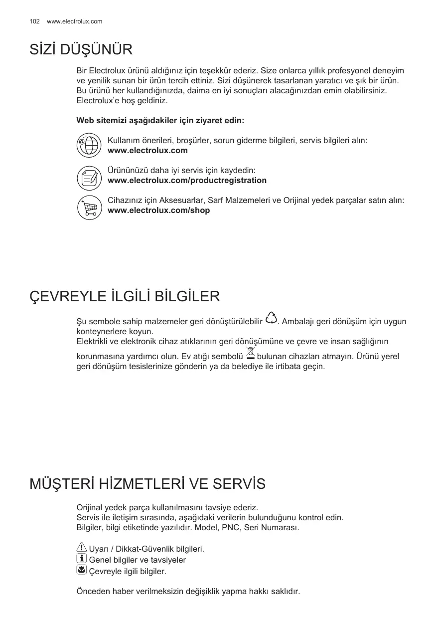 Bir Electrolux ürünü aldığınız için teşekkür ederiz. Size onlarca yıllık profesyonel deneyim ve yenilik sunan bir ürün tercih ettiniz. Sizi düşünerek tasarlanan yaratıcı ve şık bir ürün. Bu ürünü her kullandığınızda, daima en iyi sonuçları alacağınızdan emin olabilirsiniz. Electrolux’e hoş geldiniz. Web sitemizi aşağıdakiler için ziyaret edin: Kullanım önerileri, broşürler, sorun giderme bilgileri, servis bilgileri alın: www.electrolux.com Ürününüzü daha iyi servis için kaydedin: www.electrolux.com/productregistration Cihazınız için Aksesuarlar, Sarf Malzemeleri ve Orijinal yedek parçalar satın alın: www.electrolux.com/shop