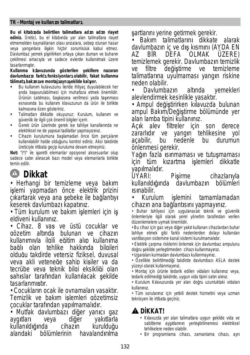La hotte peut avoir des configurations esthétiques différentes par rapport à ce qui est illustré dans les dessins de ce manuel, cependant les instructions pour l’utilisation, l’entretien et l’installation restent identiques. • Il est important de conserver ce livret pour pouvoir le consulter à tout moment. En cas de vente, de cession ou de déménagement, assurez-vous que la notice d'utilisation l'accompagne. • Veuillez lire attentivement les instructions, vous trouverez des informations importantes sur l'installation, le mode d'emploi et la sécurité. • Ne pas effectuer des modifications électriques ou mécaniques sur le produit ou sur les conduits d’évacuation. • Avant d'installer l'appareil, vérifiez qu’il n’y a aucun composant endommagé. Sinon, contactez votre revendeur et ne continuez pas l'installation. Remarque : Les pièces portant le symbole "(*)" sont des accessoires optionnels fournis uniquement avec certains modèles ou des pièces non fournies, à acheter.