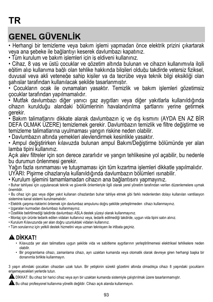 • Les enfants ne doivent pas jouer avec l’appareil. • Le nettoyage et l’entretien par l’usager ne doivent pas être effectués par des enfants sans surveillance. • La pièce doit avoir une aération suffisante lorsque la hotte est utilisée conjointement avec d'autres appareils fonctionnant au gaz ou autres combustibles. • La hotte doit être régulièrement nettoyée à la fois à l'intérieur et à l'extérieur (AU MOINS UNE FOIS PAR MOIS); cela devrait se faire en conformité avec les instructions d'entretien. Le non respect des instructions expressément fournies concernant le nettoyage de la hotte et des filtres peut provoquer des risques d'incendie. • Ne pas flamber d’aliments sous la hotte. • Pour le remplacement de la lampe, utilisez uniquement le type de lampe spécifié dans la section remplacement/maintenance lampe dans ce manuel. L'utilisation d'une flamme nue est dommageable pour les filtres et peut causer un incendie, par conséquent, il est déconseillé de l'utiliser. La friture doit être faite avec soin afin de s’assurer que l’huile surchauffée ne prenne pas feu. AVERTISSEMENT: Lorsque la table de cuisson est en fonctionnement, les parties accessibles de la hotte peuvent devenir très chaudes. • Ne pas brancher l'appareil au réseau électrique avant que l'installation ne soit complètement terminée.