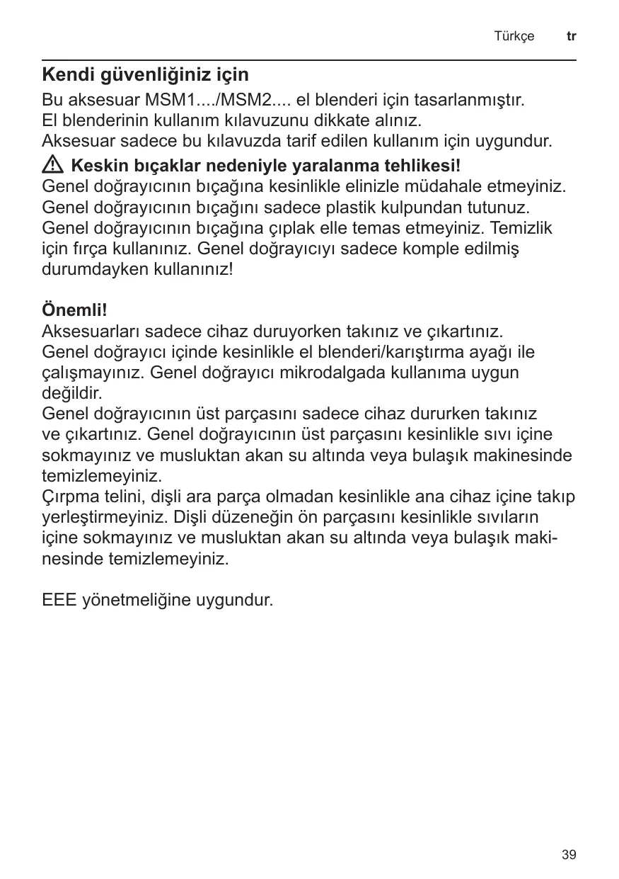Achtung! Getriebevorsatz nie in Wasser tauchen und nicht unter fließendem Wasser oder in der ■■ Place universal cutter on a smooth, clean work surface and press into position. ■■ Insert blade. L’accessoire ne convient qu’à l’utilisation décrite dans la présente notice. WW Risques de blessures avec les lames tranchantes ! N’introduisez jamais les doigts dans le logement de la lame du broyeur universel. Ne saisissez les lames du broyeur universel que par la poignée en plastique. Ne touchez jamais à main nue la lame du broyeur universel. Pour nettoyer, utilisez une brosse. N’utilisez le broyeur universel qu’à l’état entièrement assemblé ! Important ! Ne montez et démontez l'accessoire qu'une fois l'appareil immobile. Ne travaillez jamais avec le mixeur plongeant / le pied mixeur dans le broyeur universel. Le broyeur universel ne va pas au four micro-ondes. Montez et retirez l'élément superposé du broyeur universel uniquement pendant que l’appareil ne tourne pas. Ne plongez jamais l'élément superposé du broyeur universel dans des liquides, ne le nettoyez pas sous un jet d'eau ou au lave-vaisselle. N’introduisez jamais le fouet dans l’appareil de base sans vous servir de l’embout démultiplicateur. Ne plongez jamais l’embout démultiplicateur dans des liquides, ne le nettoyez pas sous un jet d'eau ou au lave-vaisselle.