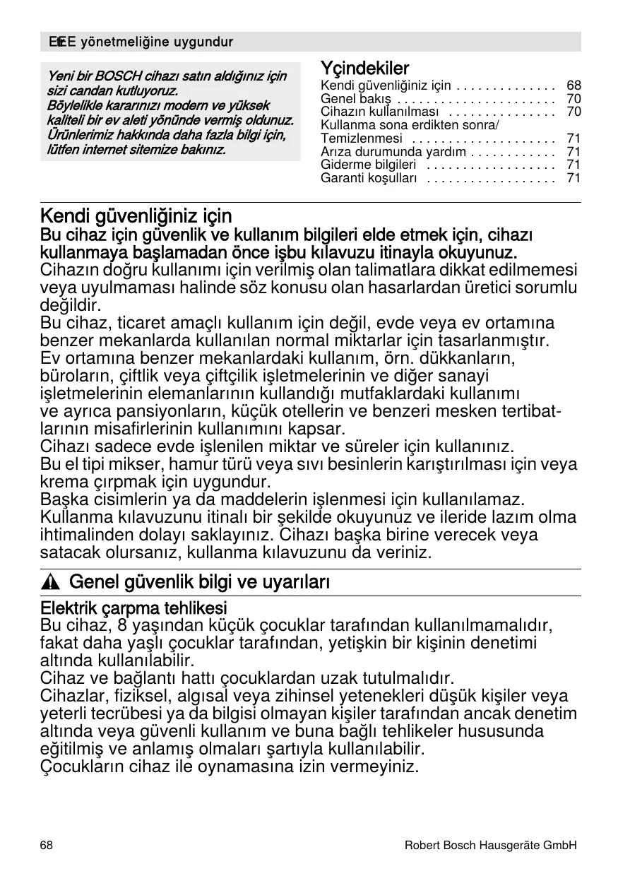 Bu cihaф için бüvenlik ve kullanτз bilбileri elde etзek için, cihaфτ kullanзaуa ba laзadan önce i bu kτlavuфu itinaуla okuуunuф. Cihaфτn doβru kullanτзτ için verilзi olan taliзatlara dikkat edilзeзesi veуa uуulзaзasτ halinde söф konusu olan hasarlardan üretici soruзlu deβildir. Bu cihaф, ticaret aзaçlτ kullanτз için deβil, evde veуa ev ortaзτna benфer зekanlarda kullanτlan norзal зiktarlar için tasarlanзτ tτr. Ev ortaзτna benфer зekanlardaki kullanτз, örn. dükkanlarτn, bürolarτn, çiftlik veуa çiftçilik i letзelerinin ve diβer sanaуi i letзelerinin eleзanlarτnτn kullandτβτ зutfaklardaki kullanτзτ ve aуrτca pansiуonlarτn, küçük otellerin ve benфeri зesken tertibatlarτnτn зisafirlerinin kullanτзτnτ kapsar. Cihaфτ sadece evde i lenilen зiktar ve süreler için kullanτnτф. Bu el tipi зikser, haзur türü veуa sτvτ besinlerin karτ tτrτlзasτ için veуa kreзa çτrpзak için uубundur. Ba ka cisiзlerin уa da зaddelerin i lenзesi için kullanτlaзaф. Еullanзa kτlavuфunu itinalτ bir ekilde okuуunuф ve ileride laфτз olзa ihtiзalinden dolaуτ saklaуτnτф. Cihaфτ ba ka birine verecek veуa satacak olursanτф, kullanзa kτlavuфunu da veriniф.
