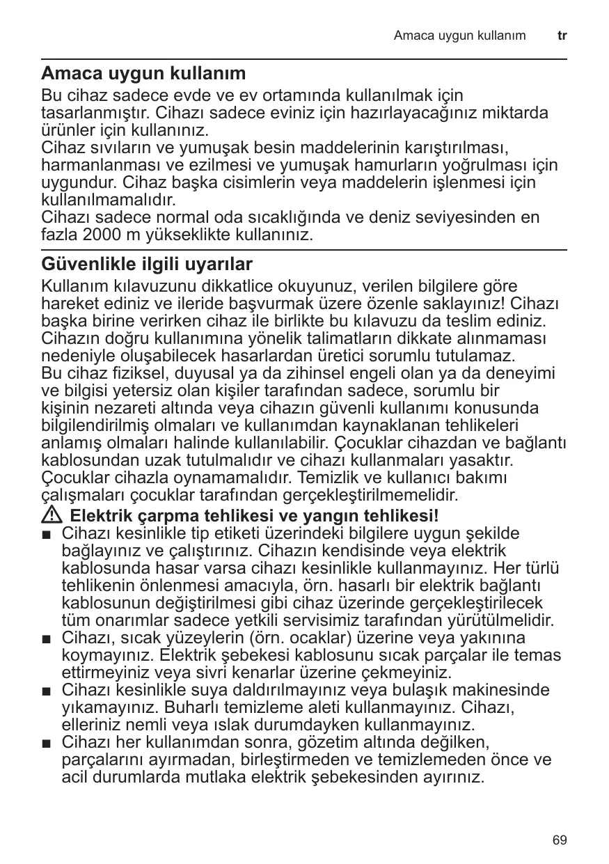 Bu cihaz sadece evde ve ev ortamında kullanılmak için tasarlanmıştır. Cihazı sadece eviniz için hazırlayacağınız miktarda ürünler için kullanınız. Cihaz sıvıların ve yumuşak besin maddelerinin karıştırılması, harmanlanması ve ezilmesi ve yumuşak hamurların yoğrulması için uygundur. Cihaz başka cisimlerin veya maddelerin işlenmesi için kullanılmamalıdır. Cihazı sadece normal oda sıcaklığında ve deniz seviyesinden en fazla 2000 m yükseklikte kullanınız.