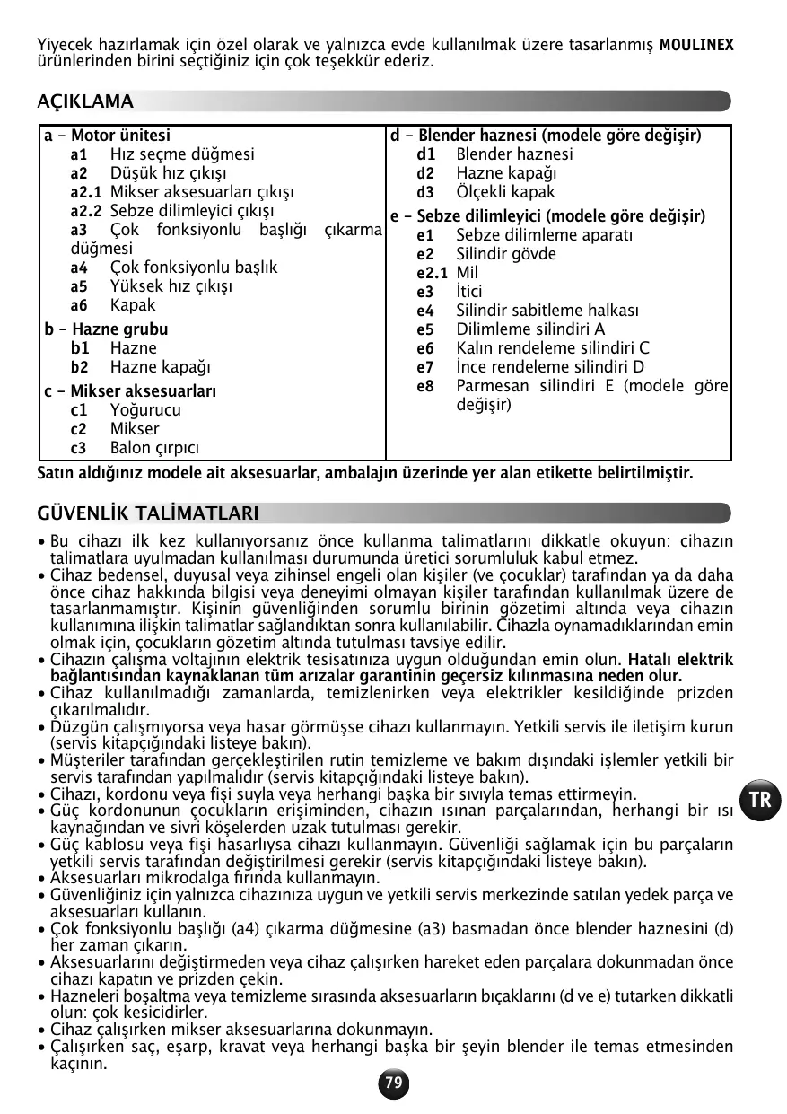 • Lisez attentivement le mode d’emploi avant la première utilisation de votre appareil : une utilisation non conforme au mode d’emploi dégagerait le fabricant de toute responsabilité. • Cet appareil n’est pas prévu pour être utilisé par des personnes (y compris les enfants) dont les capacités physiques, sensorielles ou mentales sont réduites ou des personnes dénuées d’expérience ou de connaissance, sauf si elles ont pu bénéficier, par l’intermédiaire d’une personne responsable de leur sécurité, d’une surveillance ou d’instructions préalables concernant l’utilisation de l’appareil. Il convient de surveiller les enfants pour s’assurer qu’ils ne jouent pas avec l’appareil. • Vérifiez que la tension d’alimentation de votre appareil correspond bien à celle de votre installation électrique. Toute erreur de branchement annule la garantie. • Débranchez toujours l’appareil dès que vous cessez de l’utiliser, en cas de coupure de courant et lorsque vous le nettoyez. • N’utilisez pas votre appareil s’il ne fonctionne pas correctement ou s’il a été endommagé. Dans ce cas, adressez-vous à un centre agréé (voir liste dans le livret service). • Toute intervention autre que le nettoyage et l’entretien usuel par le client doit être effectuée par un centre agréé (voir liste dans le livret service). • Ne mettez pas l’appareil, le câble d’alimentation ou la fiche dans l’eau ou tout autre liquide. • Ne laissez pas le câble d’alimentation pendre à portée de mains des enfants, être à proximité ou en contact avec les parties chaudes de l’appareil, près d’une source de chaleur ou sur un angle vif. • Si le câble d’alimentation ou la fiche sont endommagés, n’utilisez pas l’appareil. Afin d’éviter tout danger faites-les obligatoirement remplacer par un centre agréé (voir liste dans le livret service). • Ne passez pas les accessoires au micro-ondes. • Pour votre sécurité, n’utilisez que des accessoires et des pièces détachées adaptés à votre appareil, vendus en centre agréé. • Retirez toujours le bol mixeur (d) avant d’actionner le bouton de déverrouillage (a3) de la tête multifonctions (a4). • Mettez l’appareil à l’arrêt et déconnectez-le de l’alimentation avant de changer les accessoires ou d’approcher les parties qui sont mobiles lors du fonctionnement. • Des précautions doivent être prises lors de la manipulation des couteaux affûtés des accessoires (d et e) lorsqu’on vide les bols et lors du nettoyage : ils sont extrêmement coupants. 7