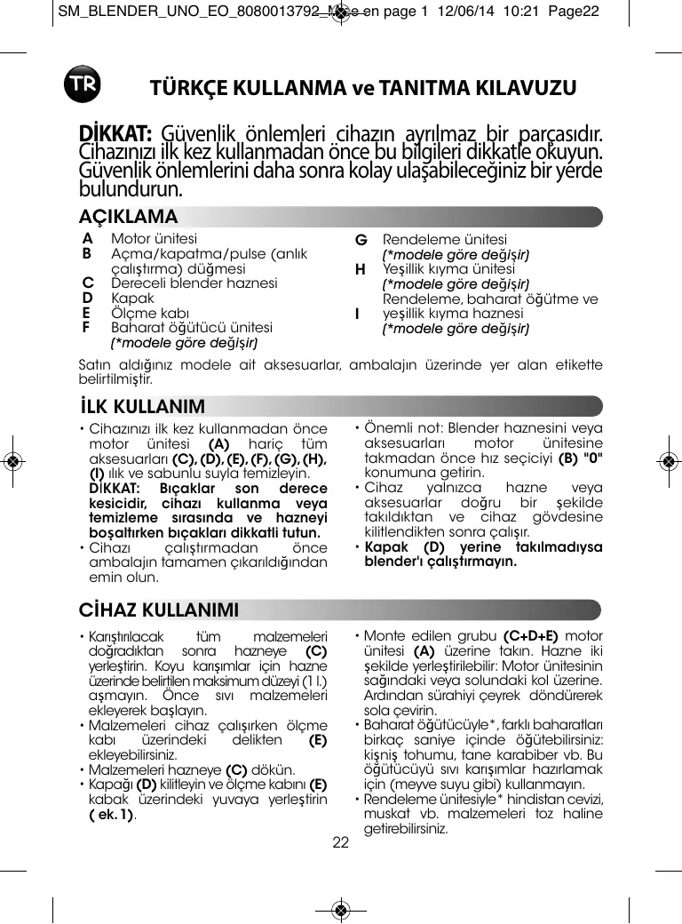 • Assurez-vous que tout emballage soit retiré avant le fonctionnement de l’appareil. • Remarque importante : Mettre le sélecteur de vitesse (B) sur «0» avant de placer le bol blender ou les accessoires sur le bloc moteur. • L’appareil démarre uniquement si le bol ou l’accessoire est bien positionné et verrouillé sur son corps. • Ne faites pas fonctionner le blender si le couvercle (D) n’est pas en place.