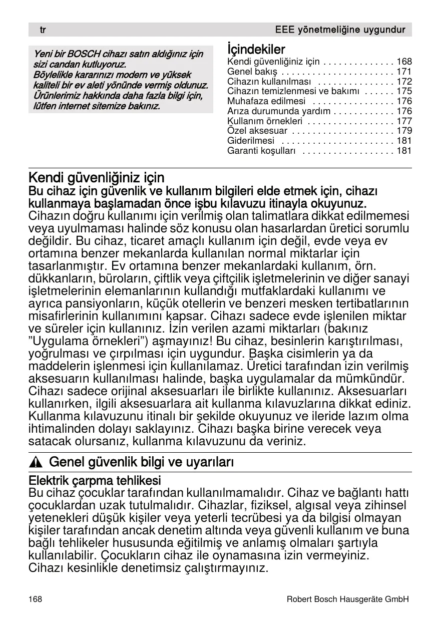 - Yeni bir BOSCH cihazı satın aldığınız için sizi candan kutluyoruz. Böylelikle kararınızı modern ve yüksek kaliteli bir ev aleti yönünde vermiş oldunuz. Ürünlerimiz hakkında daha fazla bilgi için, lütfen internet sitemize bakınız. EEE yönetmeliğine uygundur İçindekiler Kendi güvenliğiniz için p. 168