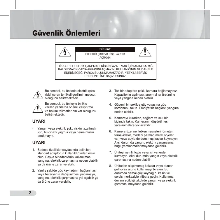 5. Kamerayı kurarken, sağlam ve sıkı bir biçimde takın. Kameranın düşürülmesi yaralanmalara yol açabilir. 6. Kamera üzerine iletken nesneleri (örneğin tornavidalar, madeni paralar, metal objeler vs.) veya suyla doldurulmuş kaplar koymayın. Aksi durumda yangın, elektrik çarpmasına bağlı yaralanmalar meydana gelebilir. 7. Üniteyi nemli, tozlu veya isli yerlerde kurmayın. Aksı durumda yangın veya elektrik çarpmasına neden olabilir. 8. Üniteden alışılmamış kokular veya duman geliyorsa ürünü kullanmayı bırakın. Bu durumda derhal güç kaynağını kesin ve servis merkeziyle irtibata geçin. Kullanıma devam edildiği takdirde yangın veya elektrik çarpması meydana gelebilir.