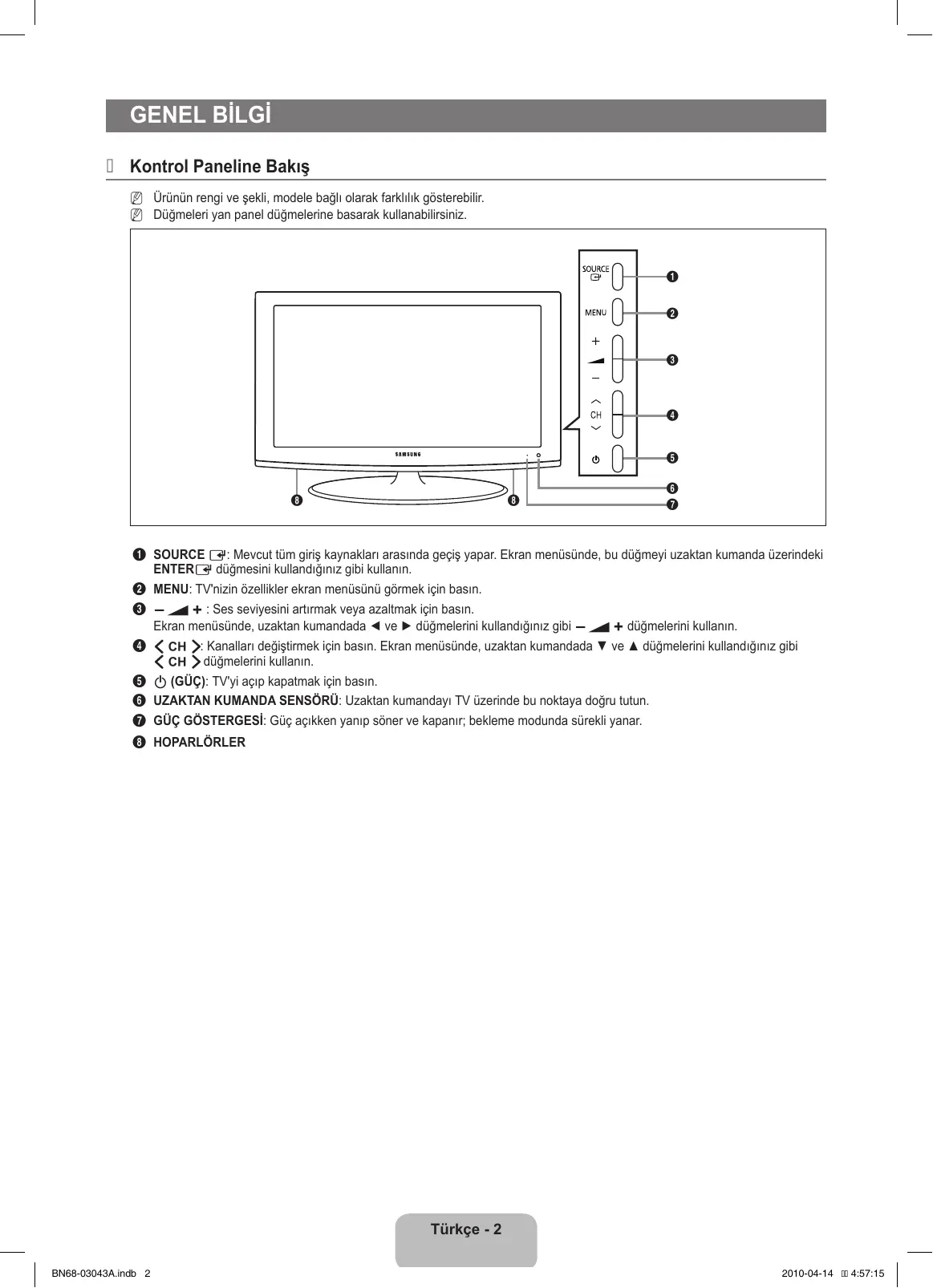 ¦¦ Kontrol Paneline Bakış NN Ürünün rengi ve şekli, modele bağlı olarak farklılık gösterebilir. NN Düğmeleri yan panel düğmelerine basarak kullanabilirsiniz.