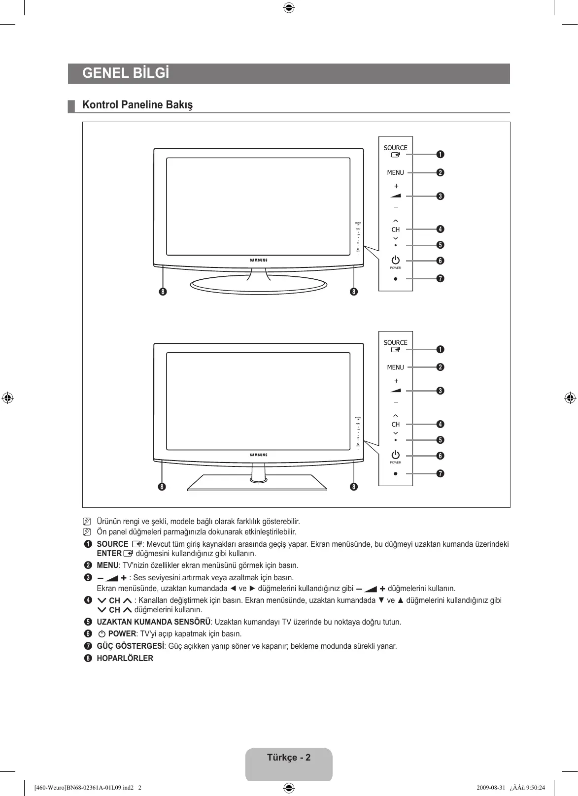 -20˚ ~ 20˚ N Zasnovo in specifikacije lahko spremenimo brez obvestila. N Naprava je digitalni aparat razreda B. N Za napajanje in porabo energije si oglejte nalepko na izdelku. Slovenščina - 30 [460-Weuro]BN68-02361A-01L09.ind30 30 2009-08-31 ¿ÀÀü 9:50:23 Ta stran je namerno puščena prazna. [460-Weuro]BN68-02361A-01L09.ind31 31 2009-08-31 ¿ÀÀü 9:50:23 Bu Kullanıcı Kılavuzundaki şekiller ve resimler yalnızca referans amaçlı verilmiştir ve gerçek ürünün görünümünden farklı olabilir. Ürün tasarımı ve belirtimleri herhangi bir bildirim yapılmaksızın değiştirilebilir. ❑ Dijital TV Uyarısı 1. Digital TV(DVB) ile ilgili olan fonksiyonellikler, yalnız DVB-T (MPEG2 ve MPEG4 AVC) dijital yer üstü sinyallerinin yayınlandığı ya da uyumlu bir DVB-C(MPEG2 ve MPEG4 AAC) kablolu TV servisine erişiminizin olduğu ülkelerde/alanlarda kullanılabilir. Lütfen bölgenizdeki DVB-T ya da DVB-C sinyallerinin alınma olasılığı hakkında yerel bayiiniz ile görüşünüz. 2. DVB-T; dijital yer üstü televizyonların yayını için bir DVB Avrupa Birliği standardıdır ve DVB-C ise, kablolu dijital TV’lerin yayını içindir Ancak, EPG (Elektrikli Program Kılavuzu), VOD (Talep üzerine video) ve diğerleri gibi bazı ayrıştırılmış özellikler, bu spesifikasyona dahil edilmemiştir. Bu nedenle, şu anda desteklenmemektedirler. 3. Bu TV seti [Ağustos, 2008] itibarıyla geçerli DVB-T ve DVB-C standartlarını karşılasa bile, gelecekteki DVB-T dijital karasal yayın ve DVB-C dijital kablo yayınları ile uyumluluğu garanti edilemez. 4. Bazı kablolu TV sağlayıcıları, bu tür bir hizmet için ek ödeme talep edebilirler ve onların koşullarına ve durumlarına uymanız gerekebilir. 5. Bazı Dijital TV fonksiyonları, bazı ülkelerde ya da bölgelerde kullanımda olmayabilir ve DVB-C, tüm sağlayıcılar ile doğru şekilde çalışmayabilir.