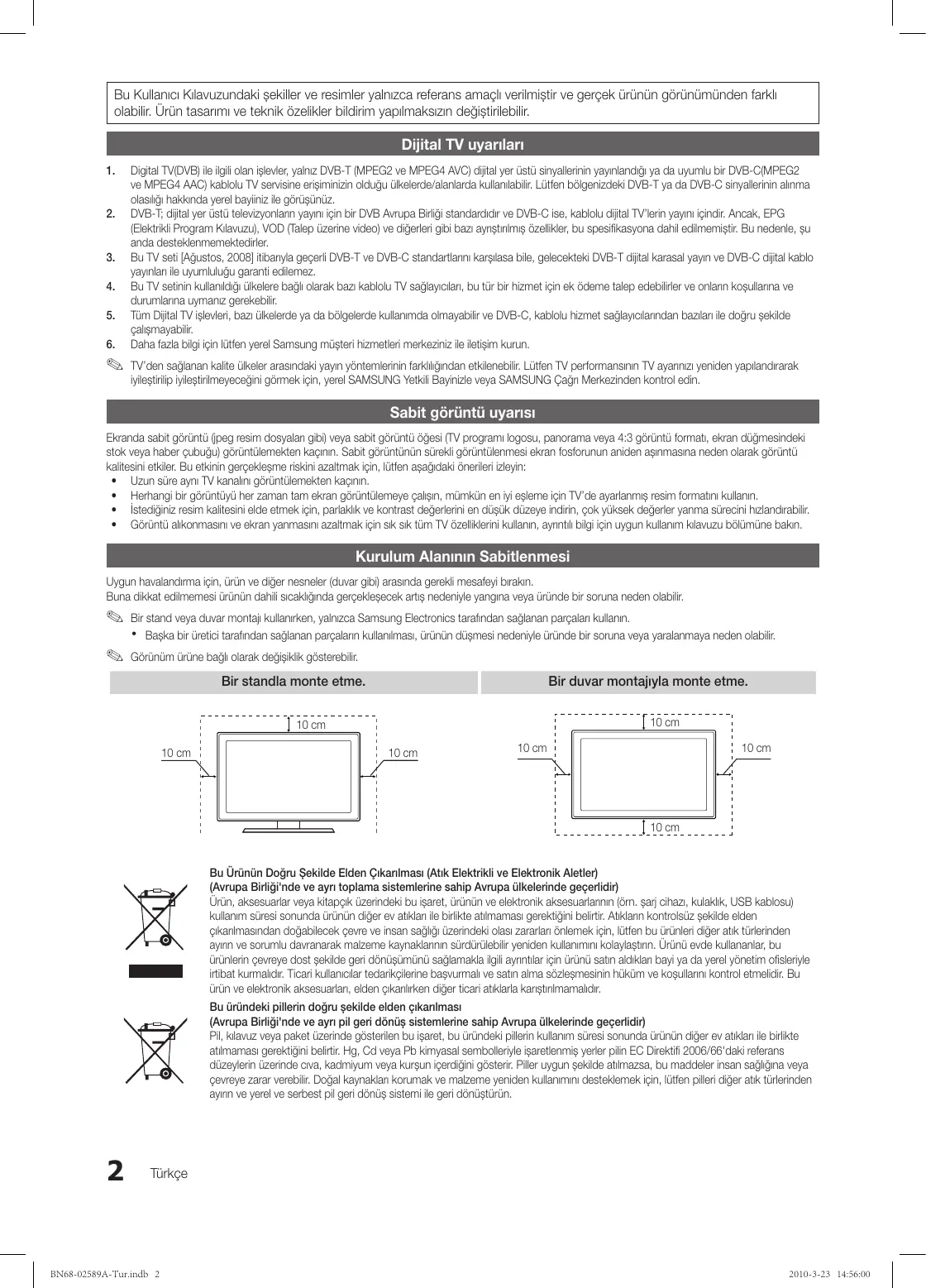 2010-3-23 14:44:15 Ta stran je namerno puščena prazna. BN68-02589A-Sln.indb 34 2010-3-23 14:44:15 Bu Kullanıcı Kılavuzundaki şekiller ve resimler yalnızca referans amaçlı verilmiştir ve gerçek ürünün görünümünden farklı olabilir. Ürün tasarımı ve teknik özelikler bildirim yapılmaksızın değiştirilebilir. Dijital TV uyarıları