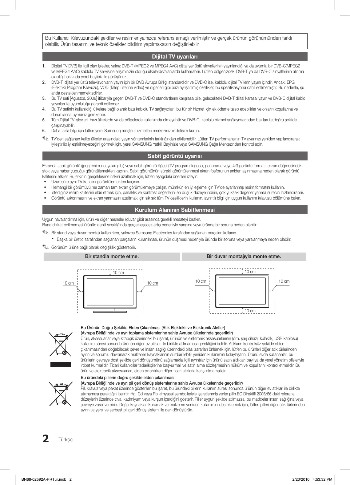 Digital TV(DVB) ile ilgili olan işlevler, yalnız DVB-T (MPEG2 ve MPEG4 AVC) dijital yer üstü sinyallerinin yayınlandığı ya da uyumlu bir DVB-C(MPEG2 ve MPEG4 AAC) kablolu TV servisine erişiminizin olduğu ülkelerde/alanlarda kullanılabilir. Lütfen bölgenizdeki DVB-T ya da DVB-C sinyallerinin alınma olasılığı hakkında yerel bayiiniz ile görüşünüz. DVB-T; dijital yer üstü televizyonların yayını için bir DVB Avrupa Birliği standardıdır ve DVB-C ise, kablolu dijital TV’lerin yayını içindir. Ancak, EPG (Elektrikli Program Kılavuzu), VOD (Talep üzerine video) ve diğerleri gibi bazı ayrıştırılmış özellikler, bu spesifikasyona dahil edilmemiştir. Bu nedenle, şu anda desteklenmemektedirler. Bu TV seti [Ağustos, 2008] itibarıyla geçerli DVB-T ve DVB-C standartlarını karşılasa bile, gelecekteki DVB-T dijital karasal yayın ve DVB-C dijital kablo yayınları ile uyumluluğu garanti edilemez. Bu TV setinin kullanıldığı ülkelere bağlı olarak bazı kablolu TV sağlayıcıları, bu tür bir hizmet için ek ödeme talep edebilirler ve onların koşullarına ve durumlarına uymanız gerekebilir. Tüm Dijital TV işlevleri, bazı ülkelerde ya da bölgelerde kullanımda olmayabilir ve DVB-C, kablolu hizmet sağlayıcılarından bazıları ile doğru şekilde çalışmayabilir. Daha fazla bilgi için lütfen yerel Samsung müşteri hizmetleri merkeziniz ile iletişim kurun.
