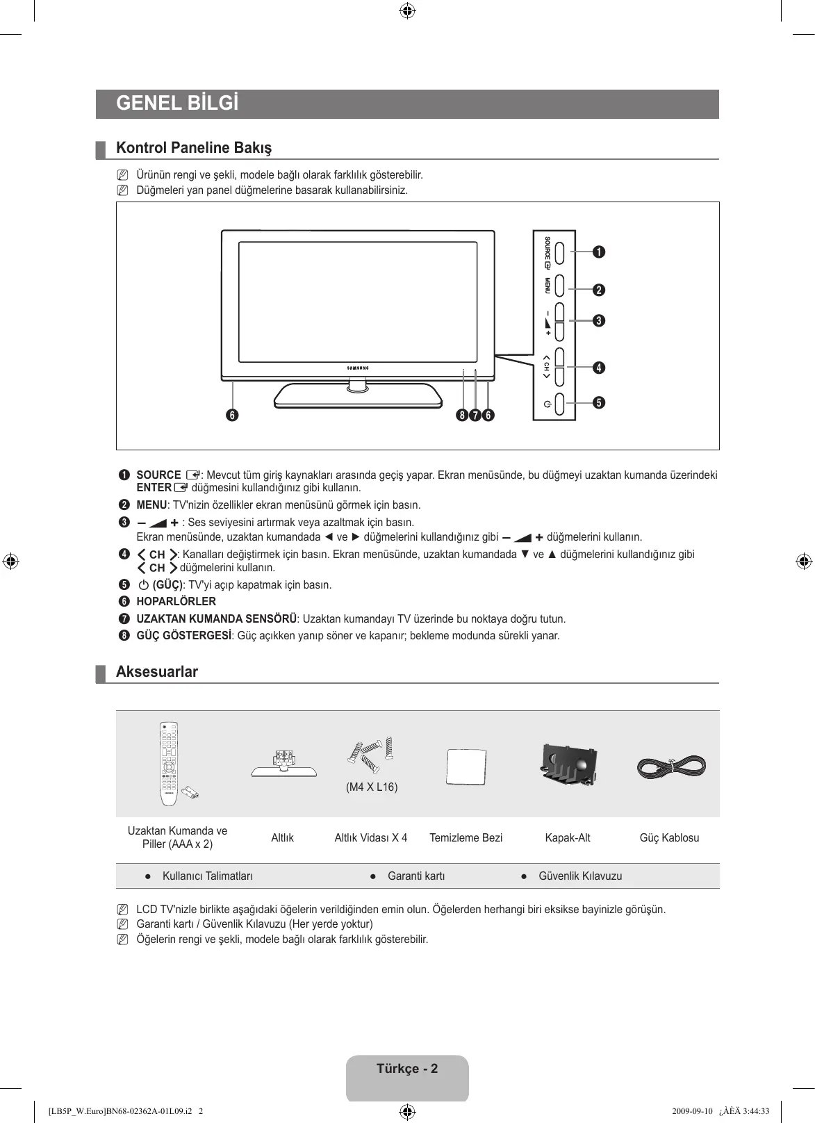 1 SOURCE E: Mevcut tüm giriş kaynakları arasında geçiş yapar. Ekran menüsünde, bu düğmeyi uzaktan kumanda üzerindeki ENTERE düğmesini kullandığınız gibi kullanın. 2 MENU: TV'nizin özellikler ekran menüsünü görmek için basın. 3 Y : Ses seviyesini artırmak veya azaltmak için basın. Ekran menüsünde, uzaktan kumandada ◄ ve ► düğmelerini kullandığınız gibi Y düğmelerini kullanın. 4 Z: Kanalları değiştirmek için basın. Ekran menüsünde, uzaktan kumandada ▼ ve ▲ düğmelerini kullandığınız gibi Z düğmelerini kullanın. 5 P (GÜÇ): TV'yi açıp kapatmak için basın. 6 HOPARLÖRLER 7 UZAKTAN KUMANDA SENSÖRÜ: Uzaktan kumandayı TV üzerinde bu noktaya doğru tutun. 8 GÜÇ GÖSTERGESİ: Güç açıkken yanıp söner ve kapanır; bekleme modunda sürekli yanar. ¦ Aksesuarlar (M4 X L16) Uzaktan Kumanda ve Piller (AAA x 2) ● Kullanıcı Talimatları Altlık Altlık Vidası X 4 Temizleme Bezi ● Garanti kartı Kapak-Alt Güç Kablosu ● Güvenlik Kılavuzu N LCD TV'nizle birlikte aşağıdaki öğelerin verildiğinden emin olun. Öğelerden herhangi biri eksikse bayinizle görüşün. N Garanti kartı / Güvenlik Kılavuzu (Her yerde yoktur) N Öğelerin rengi ve şekli, modele bağlı olarak farklılık gösterebilir. Türkçe - [LB5P_W.Euro]BN68-02362A-01L09.i2 2 2009-09-10 ¿ÀÈÄ 3:44:33 ¦ Bağlantı Paneline Bakış [TV Yan Paneli]