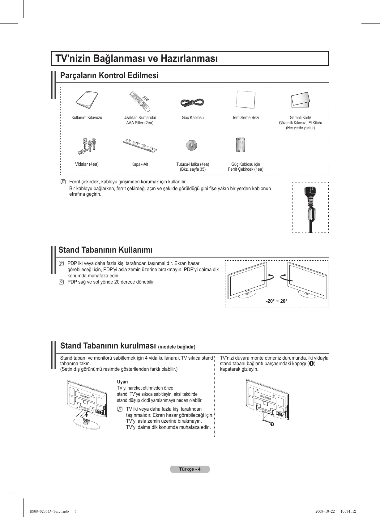 2009-10-22 10:34:09 TV'nizin Bağlanması ve Hazırlanması Parçaların Kontrol Edilmesi Kullanım Kılavuzu Uzaktan Kumanda/ AAA Piller (2ea) Güç Kablosu Temizleme Bezi Vidalar (4ea) Kapak-Alt Tutucu-Halka (4ea) (Bkz. sayfa 35) Güç Kablosu için Ferrit Çekirdek (1ea) Garanti Kartı/ Güvenlik Kılavuzu El Kitabı (Her yerde yoktur) N Ferrit çekirdek, kabloyu girişimden korumak için kullanılır. Bir kabloyu bağlarken, ferrit çekirdeği açın ve şekilde görüldüğü gibi fişe yakın bir yerden kablonun etrafına geçirin.. Stand Tabanının Kullanımı N PDP iki veya daha fazla kişi tarafından taşınmalıdır. Ekran hasar görebileceği için, PDP'yi asla zemin üzerine bırakmayın. PDP'yi daima dik konumda muhafaza edin. N PDP sağ ve sol yönde 20 derece dönebilir -20° ~ 20° Stand Tabanının kurulması (modele bağlıdır) Stand tabanı ve monitörü sabitlemek için 4 vida kullanarak TV sıkıca stand tabanına takın. (Setin dış görünümü resimde gösterilenden farklı olabilir.) TV’nizi duvara monte etmeniz durumunda, iki vidayla stand tabanı bağlantı parçasındaki kapağı (1) kapatarak gizleyin. Uyarı TV’yi hareket ettirmeden önce standı TV’ye sıkıca sabitleyin, aksi takdirde stand düşüp ciddi yaralanmaya neden olabilir. N TV iki veya daha fazla kişi tarafından taşınmalıdır. Ekran hasar görebileceği için, TV’yi asla zemin üzerine bırakmayın. TV’yi daima dik konumda muhafaza edin. Türkçe - BN68-02354A-Tur.indb