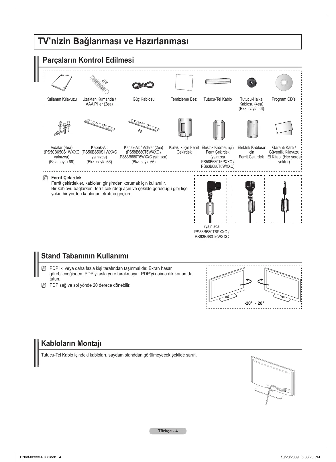 Not Tek Basmalı Düğme TOOLS Türkçe - 3 BN68-02333J-Tur.indb 3 10/20/2009 5:03:25 PM TV’nizin Bağlanması ve Hazırlanması Parçaların Kontrol Edilmesi Kullanım Kılavuzu Uzaktan Kumanda / AAA Piller (2ea) Güç Kablosu Temizleme Bezi Tutucu-Tel Kablo Tutucu-Halka Kablosu (4ea) (Bkz. sayfa 66) Program CD’si Vidalar (4ea) Kapak-Alt / Vidalar (2ea) Kulaklık için Ferrit Elektrik Kablosu için Elektrik Kablosu Kapak-Alt Garanti Kartı / (PS50B650S1WXXC (PS50B650S1WXXC