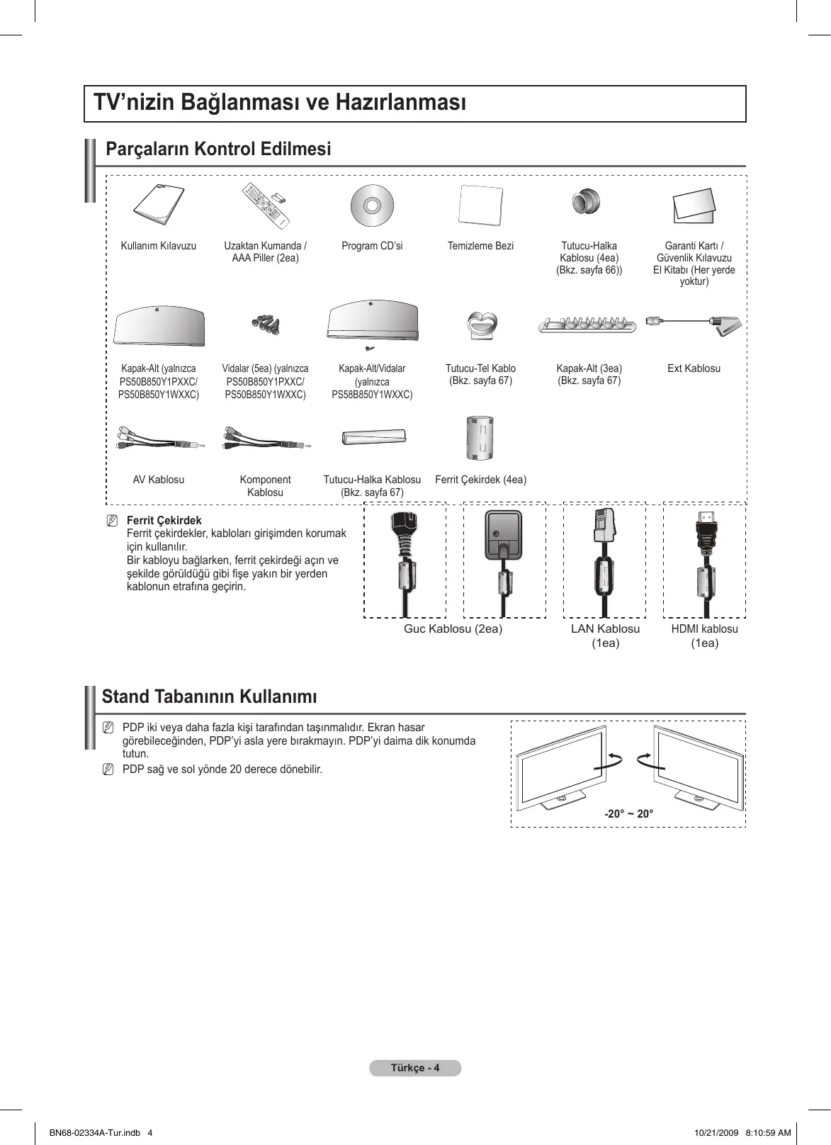 Not Tek Basmalı Düğme TOOLS Türkçe - 3 BN68-02334A-Tur-1.indd 3 10/22/2009 3:28:06 PM TV’nizin Bağlanması ve Hazırlanması Parçaların Kontrol Edilmesi Kullanım Kılavuzu Uzaktan Kumanda / AAA Piller (2ea) Program CD’si Temizleme Bezi Tutucu-Halka Kablosu (4ea) (Bkz. sayfa 66)) Garanti Kartı / Güvenlik Kılavuzu El Kitabı (Her yerde yoktur) Kapak-Alt (yalnızca