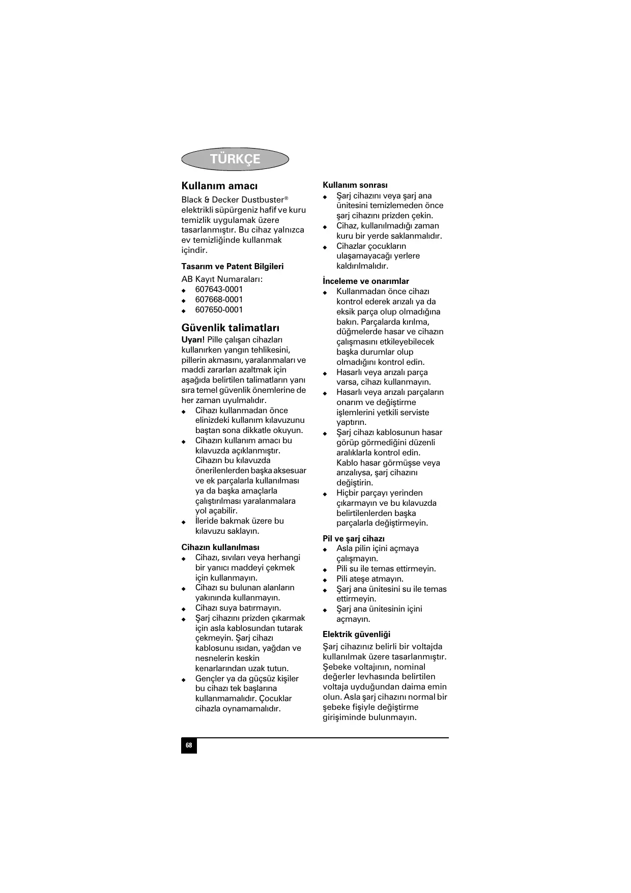 Black & Decker Dustbuster® elektrikli süpürgeniz hafif ve kuru temizlik uygulamak üzere tasarlanmıûtır. Bu cihaz yalnızca ev temizliøinde kullanmak içindir. Tasarım ve Patent Bilgileri AB Kayıt Numaraları: X 607643-0001 X 607668-0001 X 607650-0001