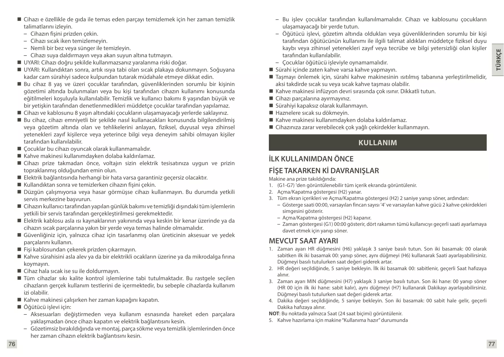 AJUSTE DE LA HORA ACTUAL 1. Mantenga presionado el botón de ajuste de la hora HR (H6) durante aproximadamente 3 segundos. Los primeros dos dígitos «00:» parpadearán mientras que los dos últimos dígitos «:00» permanecerán fijos. Podrá ajustar la hora utilizando el mismo botón (H6). Si mantiene presionado el botón, el valor de la hora aumentará progresiva y rápidamente. 2. Cuando haya seleccionado el valor de la hora (HR), espere 5 segundos. Los dos primeros dígitos «00:» permanecerán fijos y la Hora actual se memorizará. 3. Mantenga presionado el botón de ajuste de la hora MIN (H7) durante aproximadamente 3 segundos. Los últimos dos dígitos «:00» parpadearán (los dos primeros dígitos de la Hora «00:» permanecerán fijos). Podrá ajustar los minutos utilizando el mismo botón (H7). Si mantiene presionado el botón, el valor de la hora aumentará progresiva y rápidamente. 4. Cuando haya seleccionado el valor de los minutos, espere 5 segundos. Los dos últimos dígitos «:00» permanecerán fijos y los minutos actuales se memorizarán. NOTA: En ese momento, solo se mostrará la hora (en formato de 24 h). 5. El aparato estará en el modo «Listo para usar» para preparar el café.