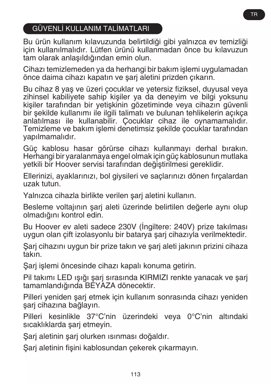 Le nettoyage et l’entretien ne devraient pas être effectués par des enfants sans supervision. Si le cordon d’alimentation est endommagé, arrêtez immédiatement d’utiliser l’appareil. Pour éviter les risques d’accident, un réparateur Hoover agréé doit remplacer le cordon d’alimentation. Maintenez les mains, pieds, vêtements et cheveux à distance des brosses rotatives. Utilisez uniquement le chargeur d’origine qui vous a été fourni avec l’appareil. Vérifiez que la tension de l’alimentation est la même que celle indiquée sur le chargeur. Cet appreil Hoover est fourni avec un chargeur de batterie doublement isolé qui n’est adapté qu’à une prise de 230 V (240 V Grande-Bretagne). Branchez le chargeur dans une prise adaptée et connectez la prise jack du chargeur dans l’appareil. Éteignez l’appareil avant de le charger. Le voyant LED du bloc batterie s’illumine en ROUGE lors de la charge et deviendra BLANC lorsque l’appareil est entièrement chargé. Rebranchez l’appareil au chargeur après l’utilisation pour recharger les batteries. Ne rechargez jamais les batteries dans des températures de plus de 37°C ou en-dessous de 0°C. Il est normal pour le chargeur de devenir chaud au toucher lorsqu’il est en train de charger. Ne pas débrancher en tirant sur le cordon d’alimentation. Débranchez le chargeur en cas d’absence prolongée (vacances, etc.). Rechargez l’appareil de nouveau avant de l’utiliser car les 8